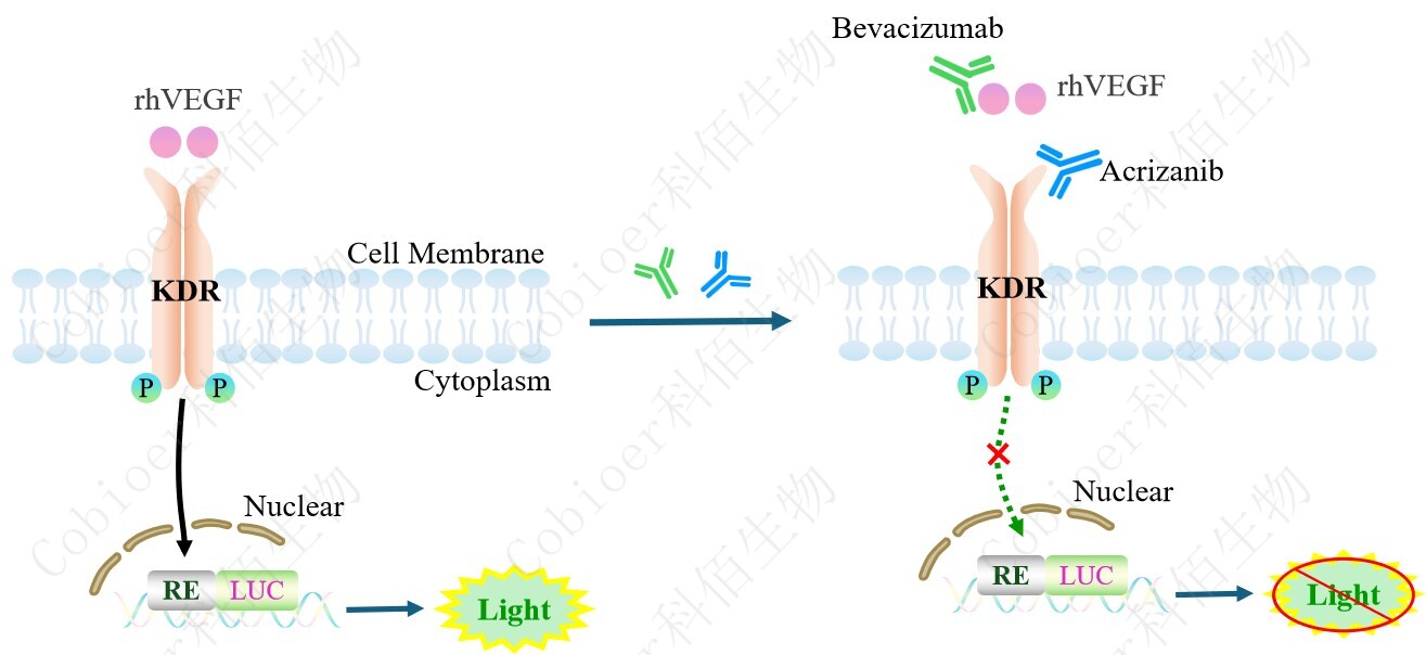 VEGF(KDR) Effector Reporter Cell 報(bào)告基因藥靶模型很好的模擬了體內(nèi) VEGF(KDR)的信號(hào)轉(zhuǎn)導(dǎo)過(guò)程,原理見(jiàn)下圖所示。