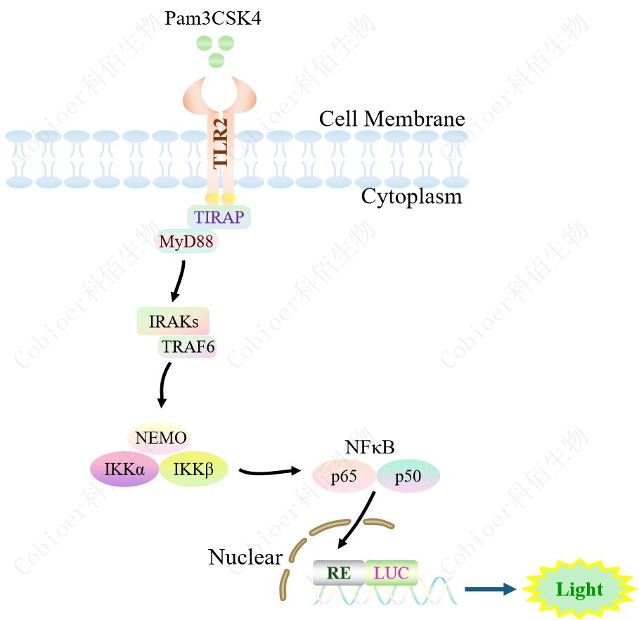 TLR2 NFκB-Luc HEK293 報(bào)告基因藥靶模型很好的模擬了體內(nèi) TLR2 的信號(hào)轉(zhuǎn)導(dǎo)過(guò)程, 原理見下圖所示。