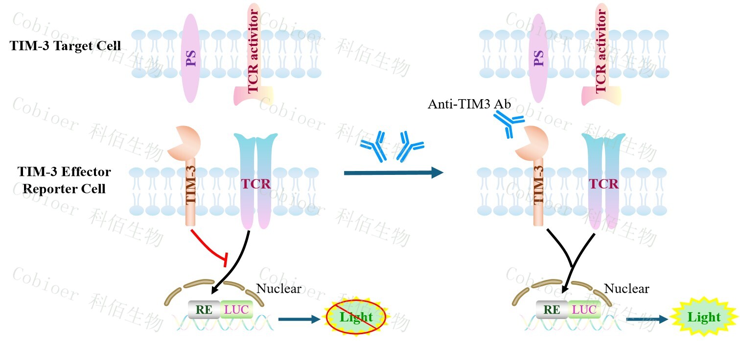 TIM-3 Effector Reporter Cell 報告基因藥靶模型很好的模擬了體內(nèi) TIM-3 的信號轉(zhuǎn)導(dǎo)過程,原理見下圖所示。![]() Figure 1. TIM-3 Effector Reporter Cell 細(xì)胞模型原理圖 |