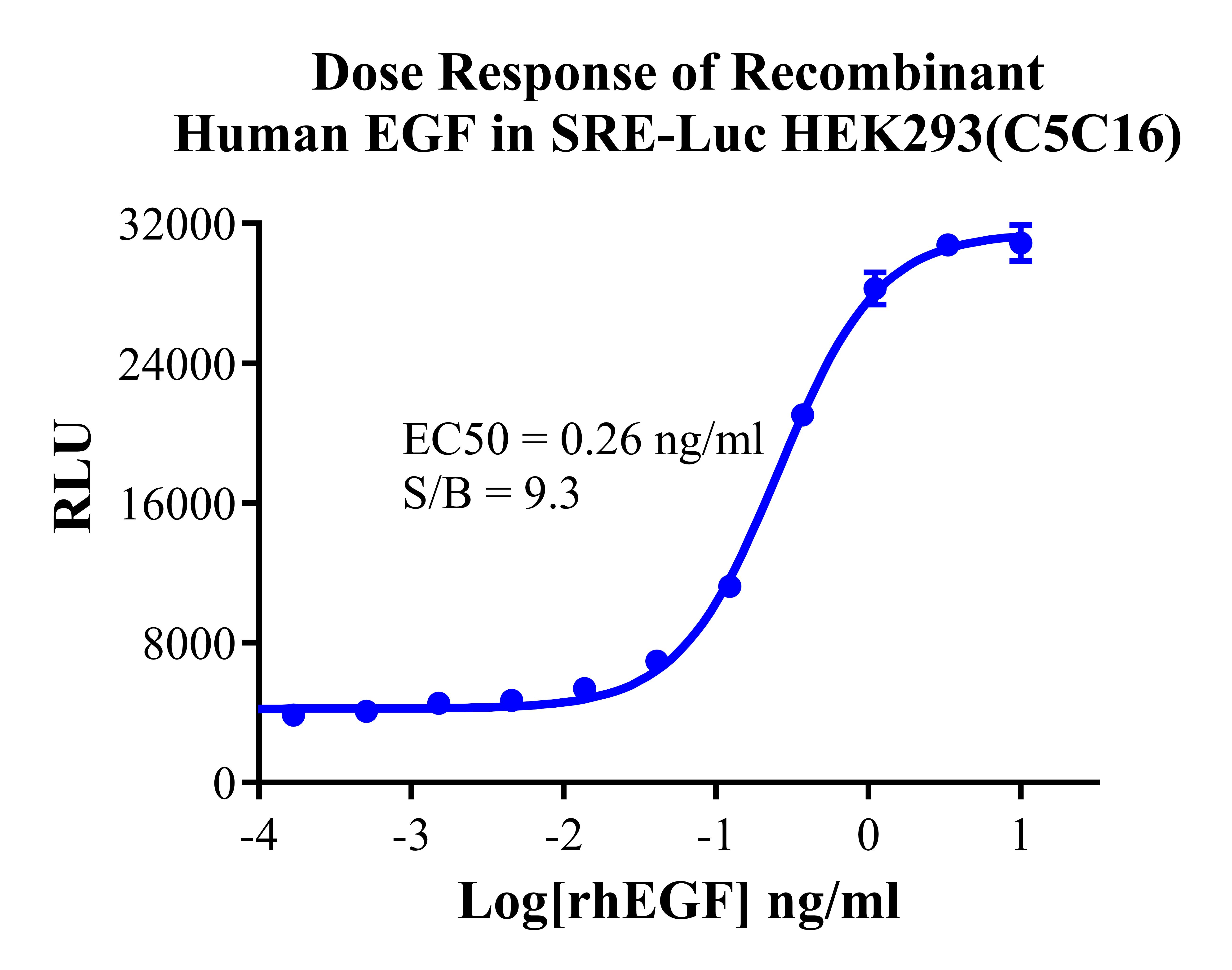 Figure 2. Detect Luciferase assay by Ultra Luciferase Detection Kit CBPH0001(we strongly suggest to purchase from Cobioer). Dose Response of Recombinant Human EGF in SRE-Luc HEK293 (C5C16).