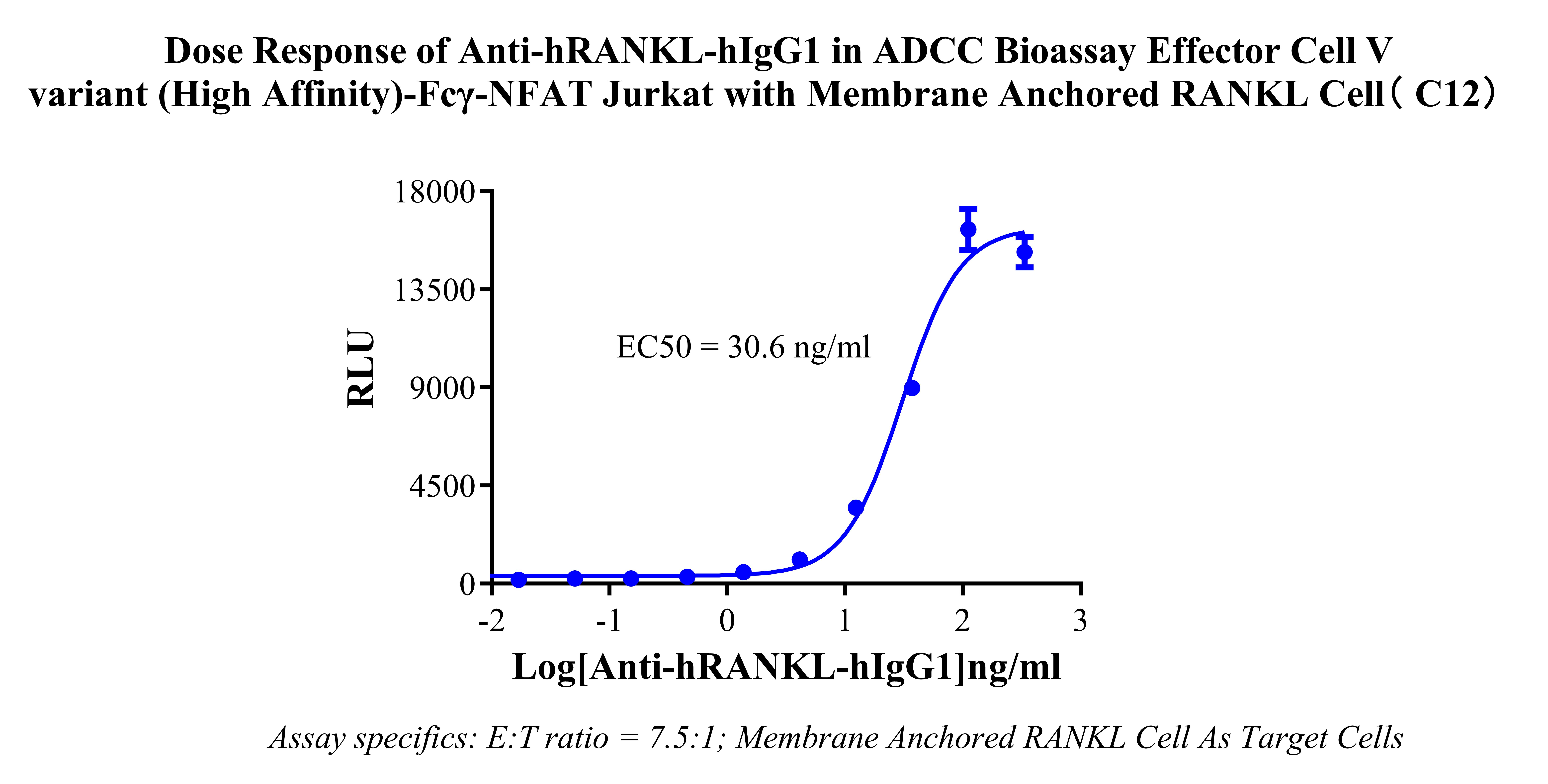 Figure 2. Dose response of Anti-hRANKL-hIgG1in ADCC Bioassay Effector Cell V variant (High Affinity)-Fcγ-NFAT Jurkat with Membrane Anchored RANKL Cell (C12).