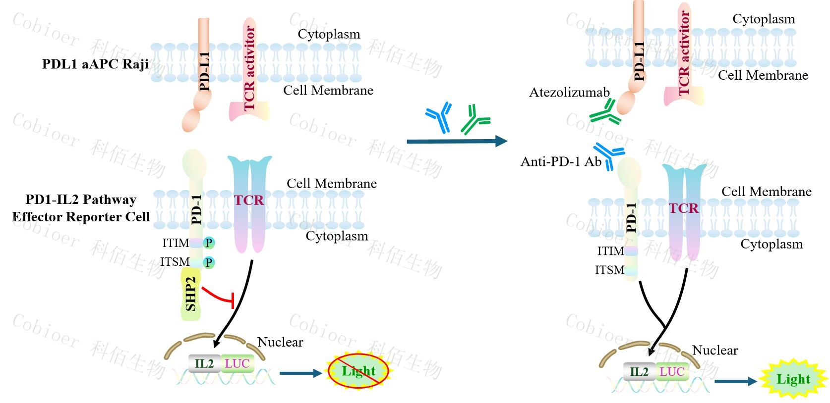 PDL1 aAPC Raji 作為 PD1-IL2 Pathway Effector Reporter Cell 的靶細胞,藥靶模型很好 的模擬了體內(nèi) PD1&PDL1 的信號轉(zhuǎn)導過程,原理見下圖所示。