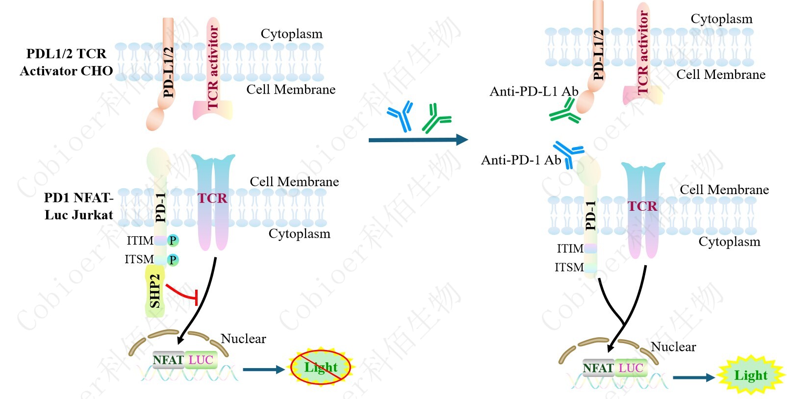 PD1 NFAT-Luc Jurkat 報告基因藥靶模型很好的模擬了體內(nèi) PD1&PDL1/PDL2 的信號轉(zhuǎn) 導過程,原理見下圖所示。