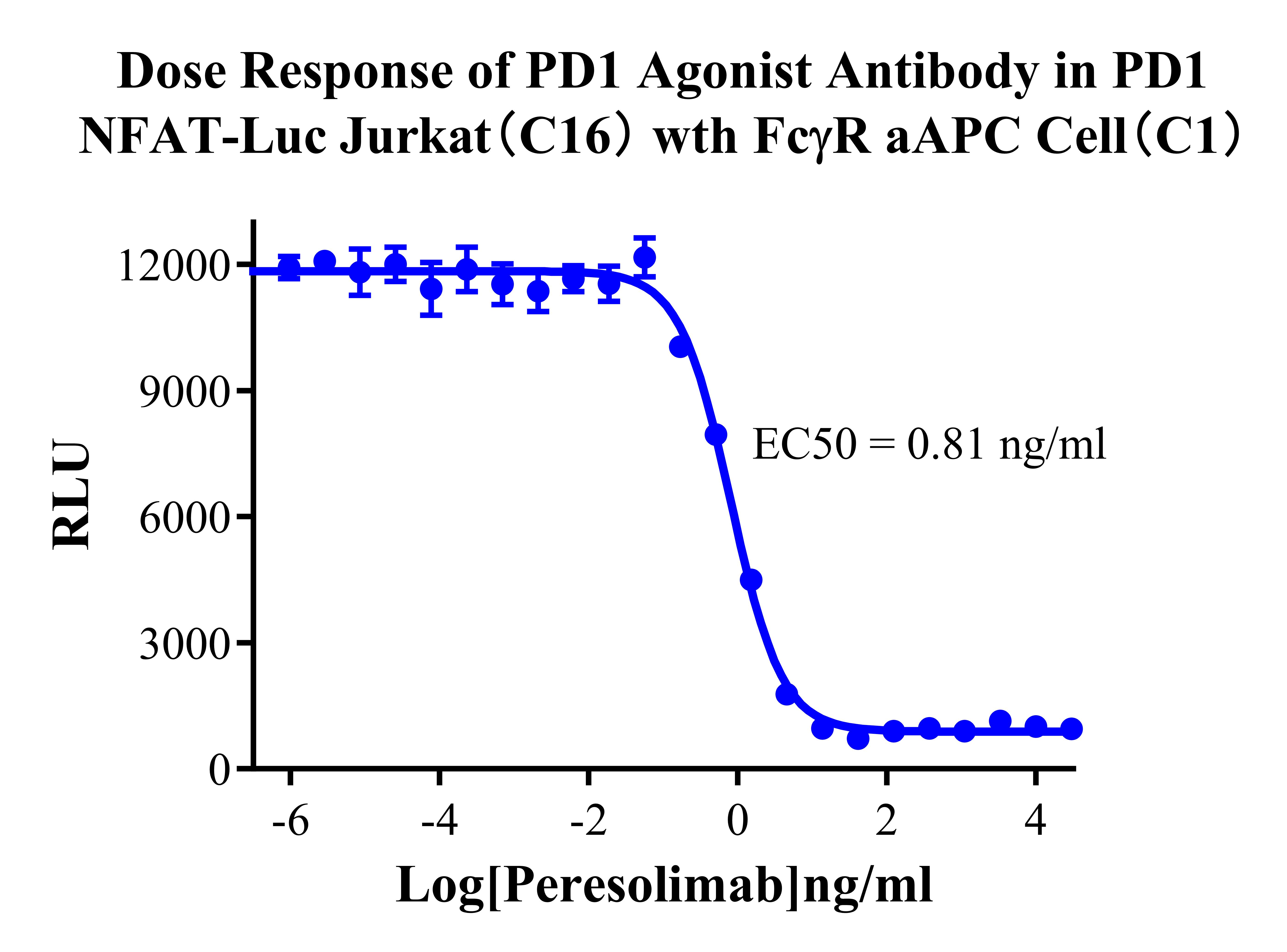 Figure 6. Detect Luciferase assay by Ultra Luciferase Detection Kit CBPH0001(we strongly suggest to purchase from Cobioer).  Dose response of PD1 Agonist  Antibody in PD1 NFAT-Luc Jurkat(C16) with FcγR aAPC Cell(C1).
