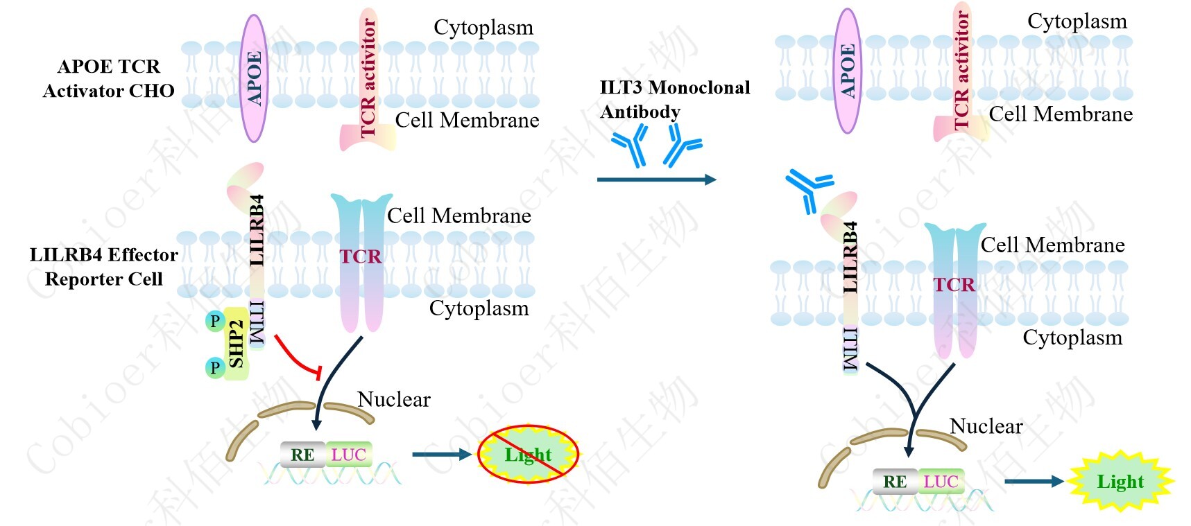 APOE TCR Activator CHO 作為 LILRB4 Effector Reporter Cell 的靶細胞,很好的模擬了 體內(nèi) LILRB4 的信號轉(zhuǎn)導(dǎo)過程,原理見下圖所示。