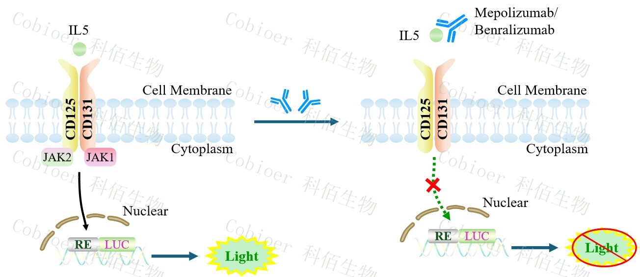 IL5 Effector Reporter Cell 報(bào)告基因藥靶模型很好的模擬了體內(nèi) IL5 的信號(hào)轉(zhuǎn)導(dǎo)過(guò)程, 原理見(jiàn)下圖所示。