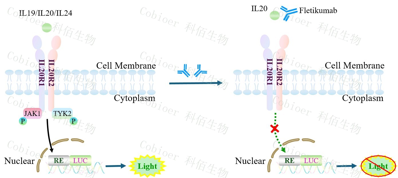 hIL19/IL20/IL24 Triple Effector Reporter Cell 報(bào)告基因藥靶模型很好的模擬了體內(nèi)IL19/IL20/IL24 的信號(hào)轉(zhuǎn)導(dǎo)過(guò)程,原理見(jiàn)下圖所示。
