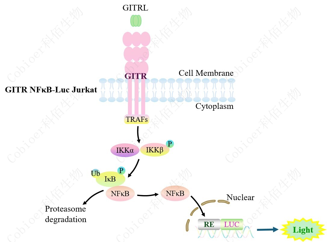 GITR NFκB-Luc Jurkat 報(bào)告基因藥靶模型很好的模擬了體內(nèi) GITR 的信號(hào)轉(zhuǎn)導(dǎo)過程, 原理見下圖所示。