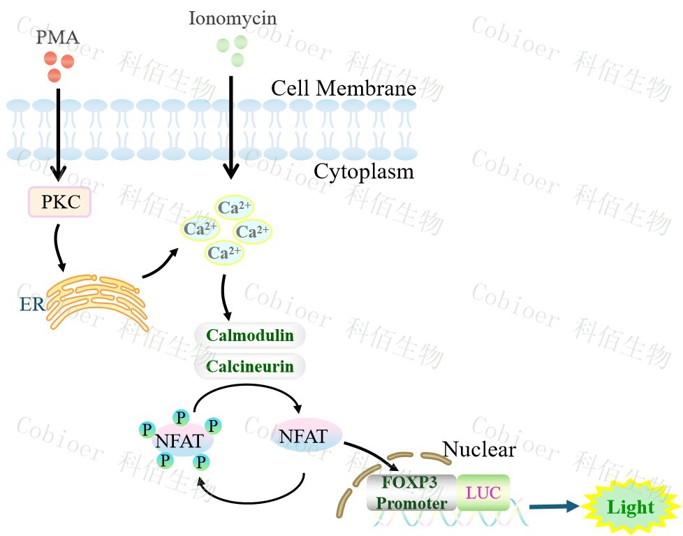 FOXP3 promoter-Luc Jurkat 報告基因細胞,是由 FOXP3 調(diào)控并表達 Luc 熒光素酶報告基因的 Jurkat 細胞。PMA 是 DAG(二酯酰甘油)的類似物,可自由的通過 細胞膜,可用于測定 CD3/CD28 介導(dǎo)的 T 細胞活化,原理見下圖所示。