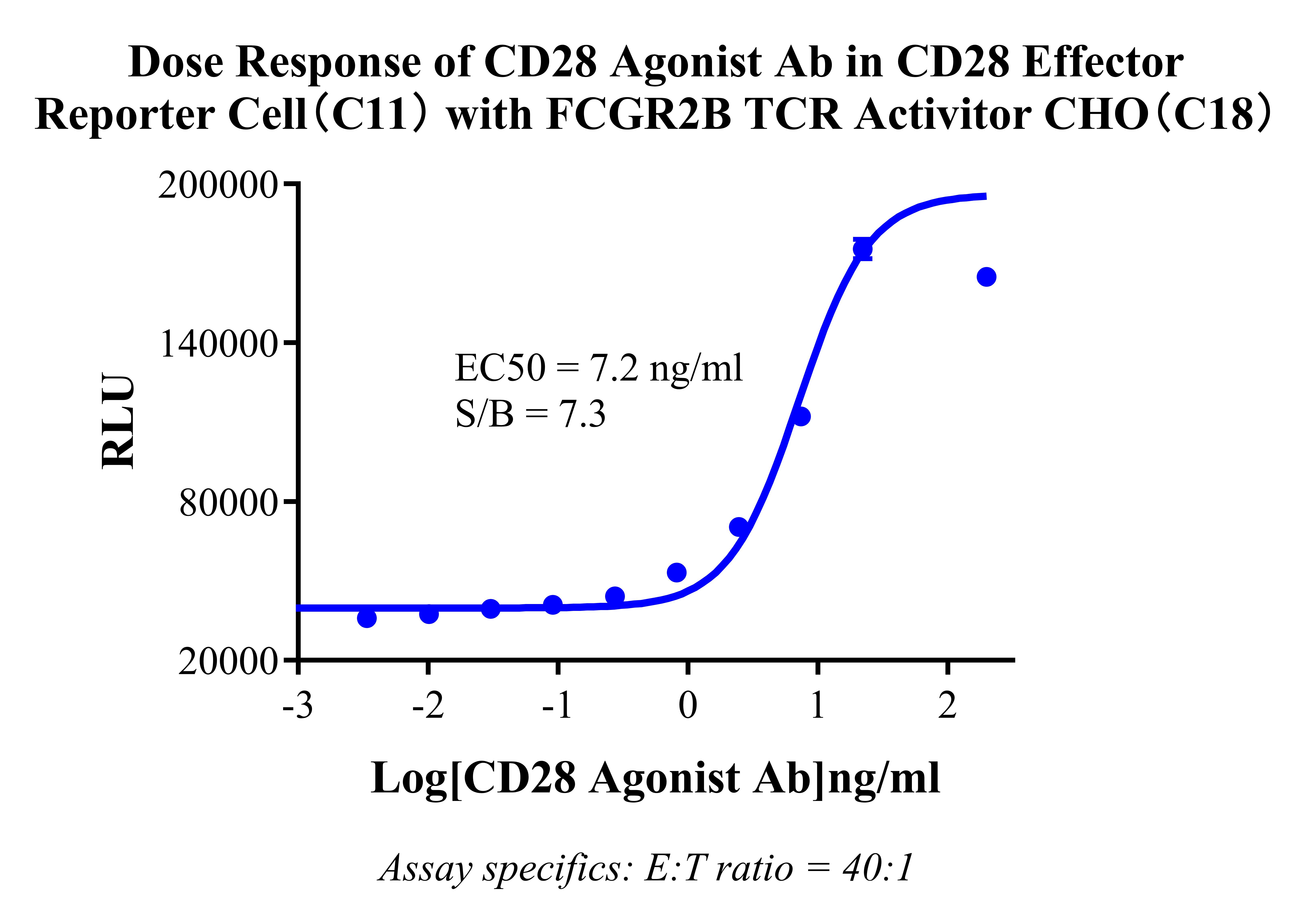 Figure 3 Dose Response of CD28 Agonist Ab in CD28 Effector Reporter Cell(C11) with FCGR2B TCR Activitor CHO(C18). |