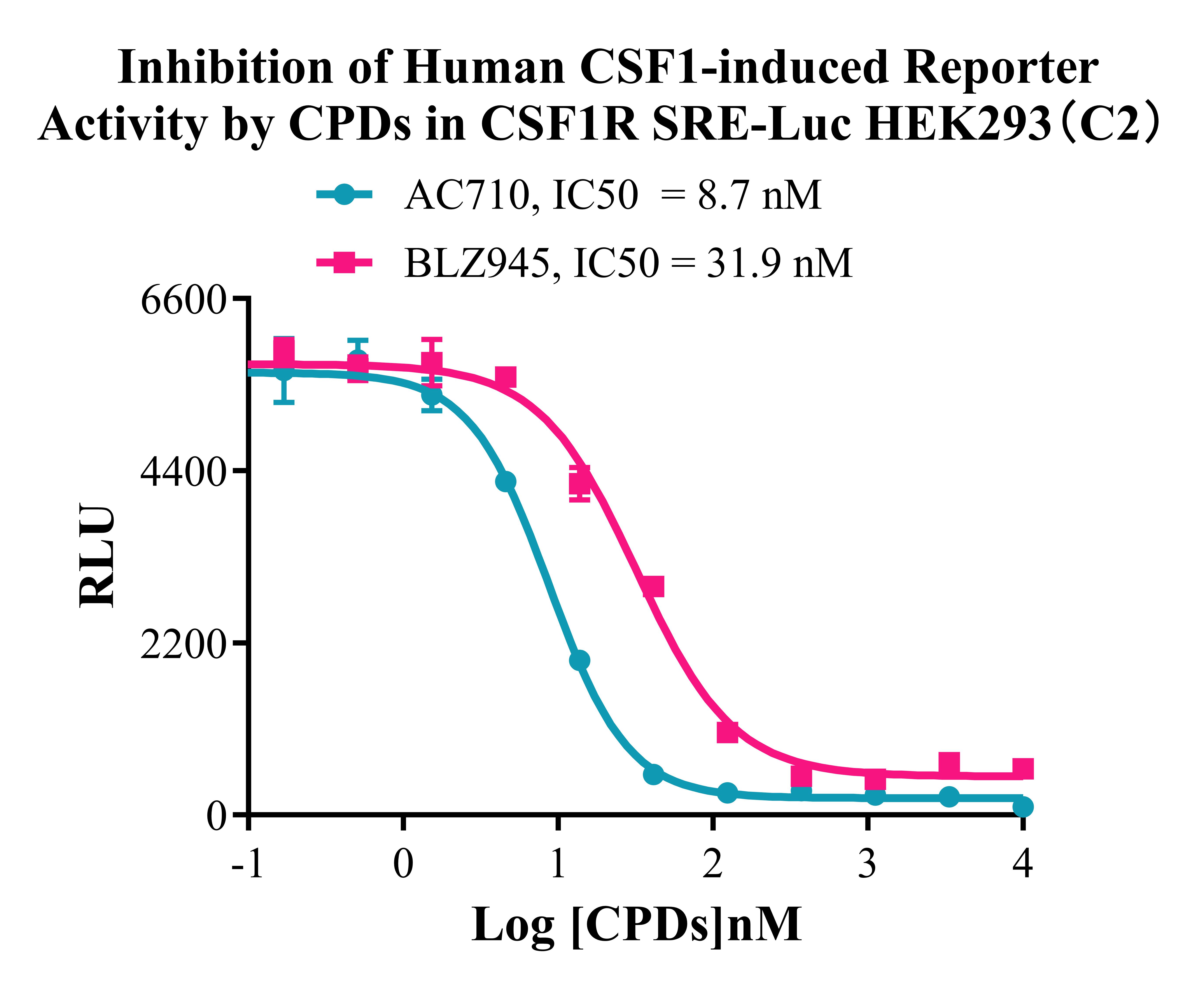 Figure 4. Inhibition of Human CSF1-induced Reporter Activity by CPDs in CSF1R SRE-Luc HEK293(C2).