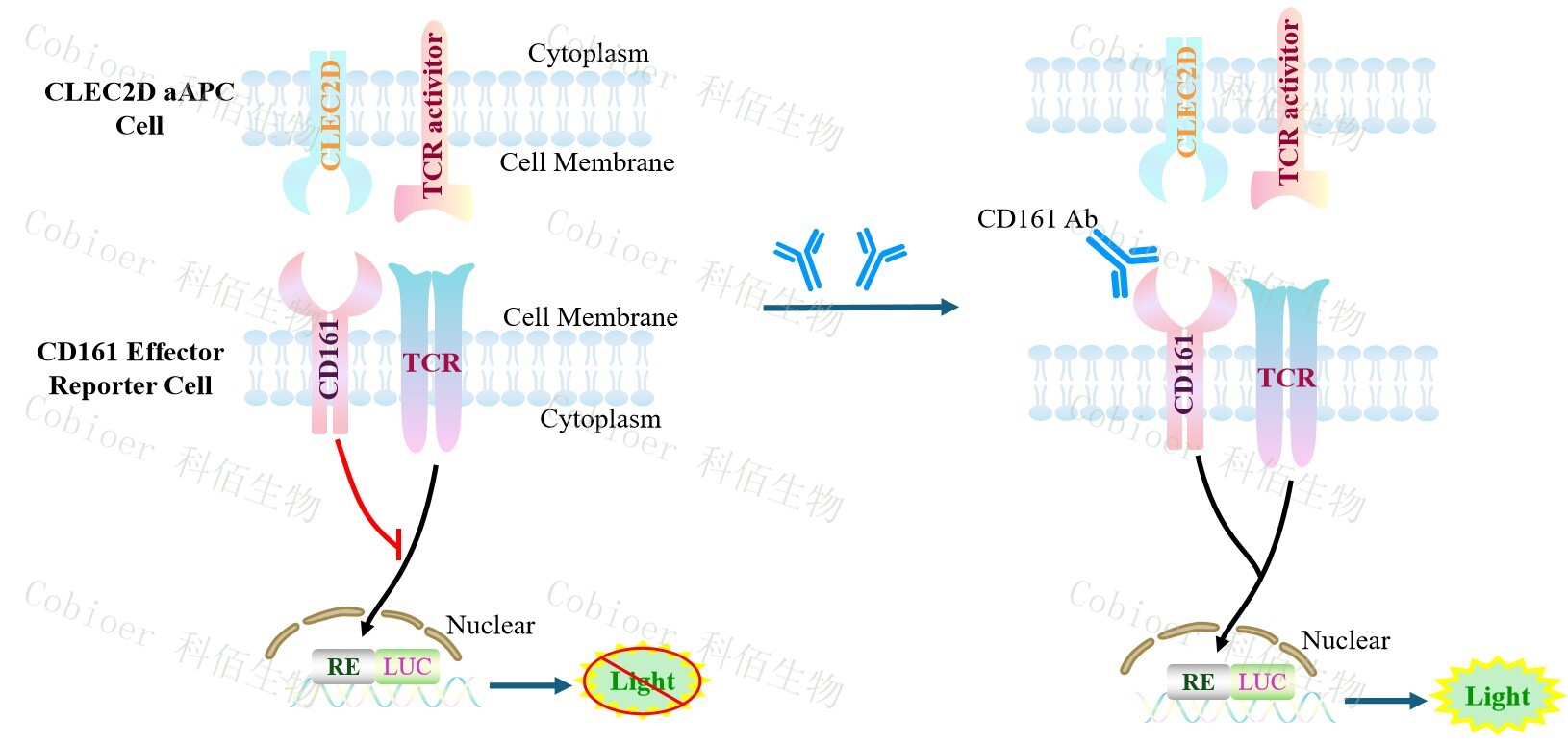 CLEC2D aAPC Cell 報(bào)告基因藥靶模型很好的模擬了體內(nèi) CD161/CLEC2D 的信號(hào)轉(zhuǎn)導(dǎo)過(guò)程,原理見下圖所示。![]() Figure 1. CLEC2D aAPC Cell 細(xì)胞模型原理圖 |