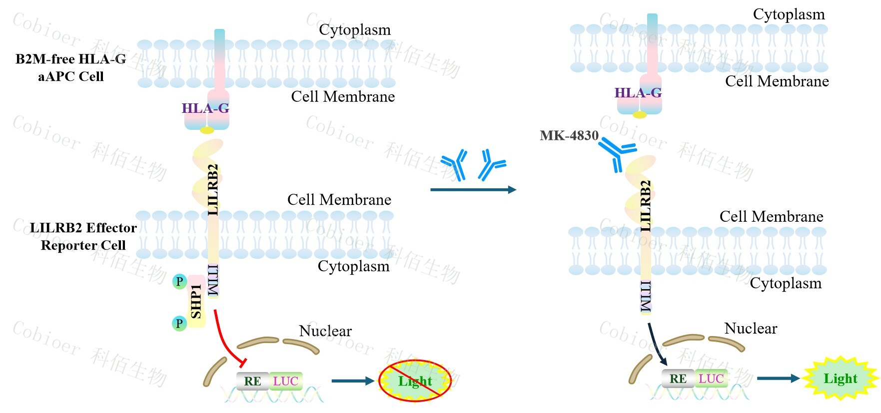 B2M-free HLA-G aAPC Cell 作為 LILRB2 Effector Reporter Cell 的靶細(xì)胞,很好的模擬 了體內(nèi) LILRB2 的信號轉(zhuǎn)導(dǎo)過程,原理見下圖所示。