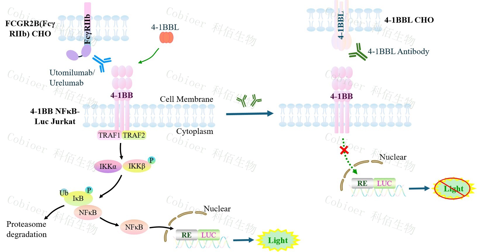 4-1BB NFκB-Luc Jurkat 報(bào)告基因藥靶模型很好的模擬了體內(nèi) 4-1BB 的信號(hào)轉(zhuǎn)導(dǎo)過程, 原理見下圖所示。
