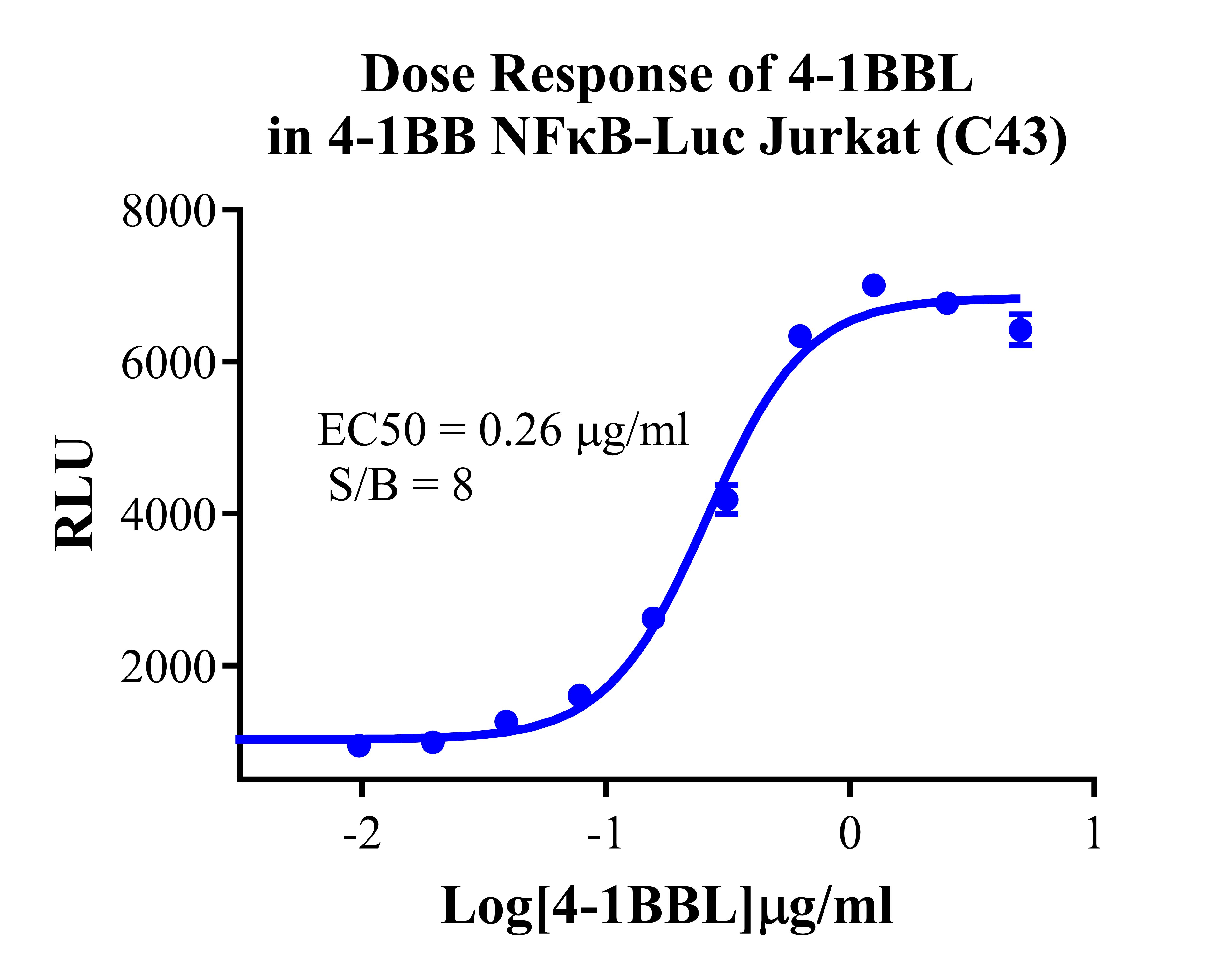 Figure 3. Detect Luciferase assay by Ultra Luciferase Detection Kit CBPH0001(we strongly suggest to purchase from Cobioer). Dose Response of 4-1BBL in 4-1BB NFκB-Luc Jurkat (C43). |