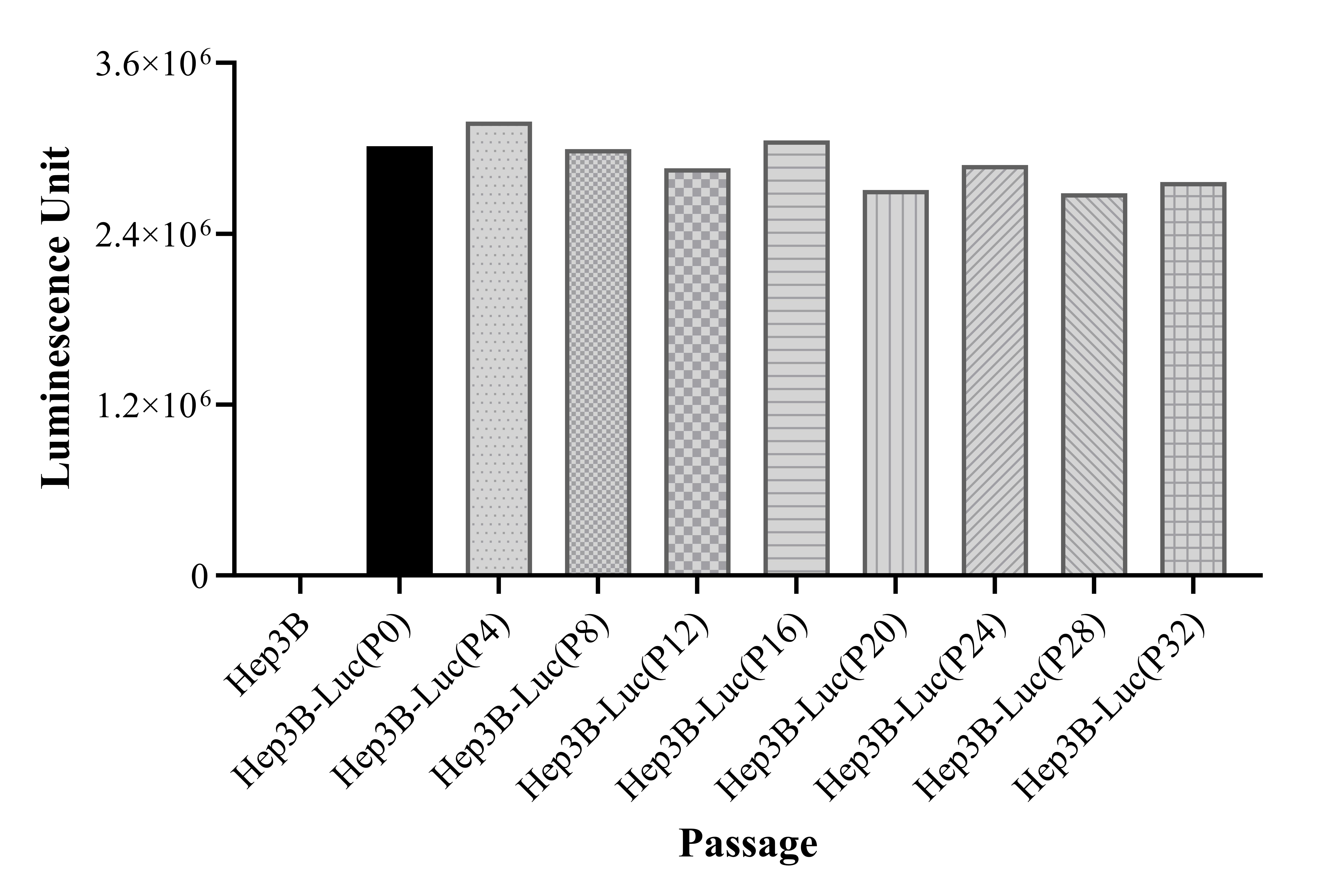 Figure 1. Stablity test results. Hep3B-Luc cells showed at least 32 passage stability with similar luminescence unit.
