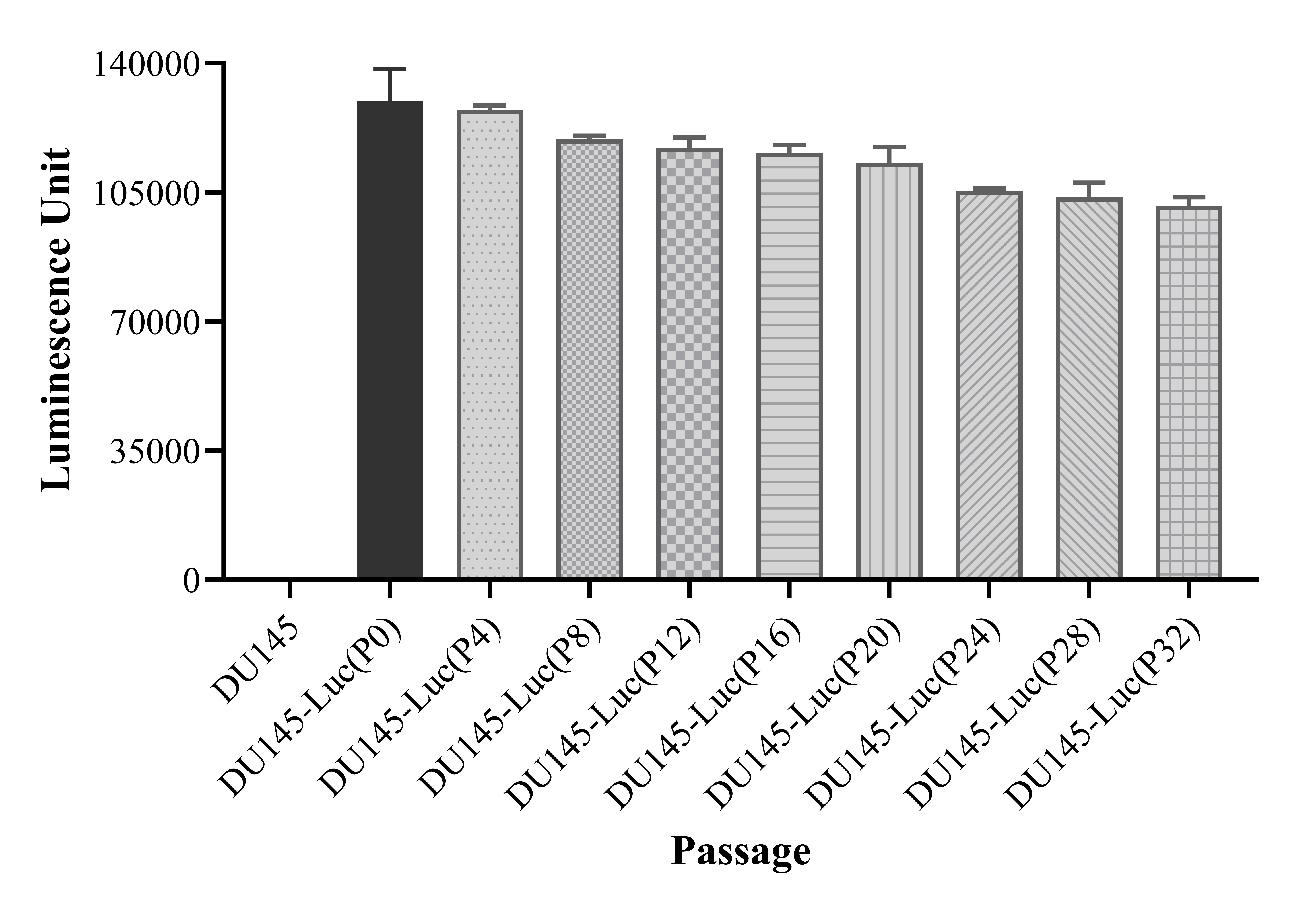 Figure 1. Stablity test results. DU145-Luc cell showed at least 32 passage stability with similar luminescence unit.