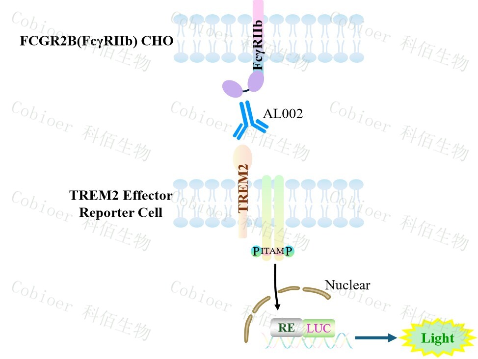 TREM2 Effector Reporter 報告基因藥靶模型很好的模擬了體內 TREM2 的信號轉導過程, 原理見下圖所示。