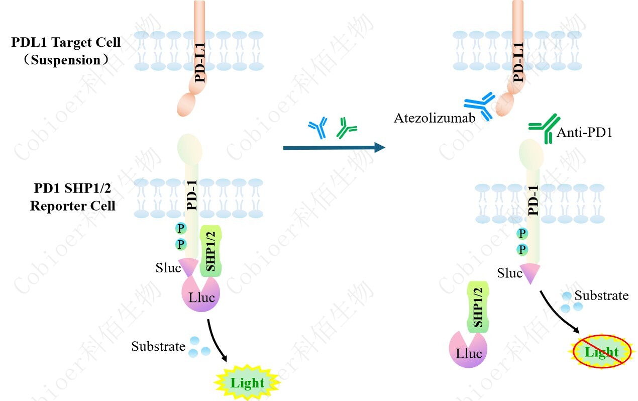 PDL1 Target Cell(Suspension)作為 PD1 SHP1 Reporter Cell 和 PD1 SHP2 Reporter Cell 的靶細(xì)胞,藥靶模型很好的模擬了體內(nèi) PD1&SHP1/SHP2 的信號(hào)轉(zhuǎn)導(dǎo)過(guò)程,原理見(jiàn)下圖所 示。![]() Figure 1. PDL1 Target Cell(Suspension)模型原理圖 |