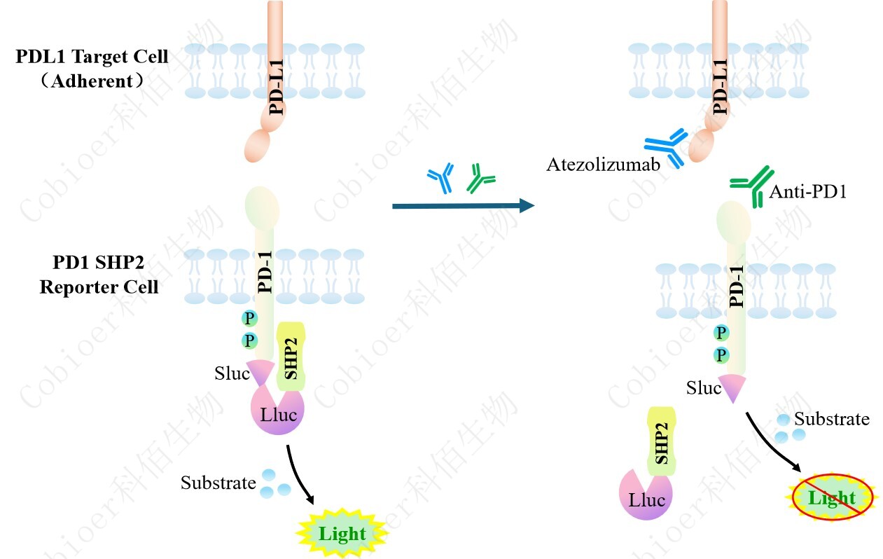PDL1 Target Cell(Adherent)作為 PD1 SHP2 Reporter Cell 的靶細(xì)胞,藥靶模型很好的 模擬了體內(nèi) PD1&SHP2 的信號(hào)轉(zhuǎn)導(dǎo)過程,原理見下圖所示。