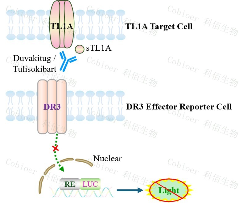 TL1A Target Cell 作為 DR3 Effector Reporter Cell 的靶細(xì)胞,很好的模擬了體內(nèi) DR3 的 信號(hào)轉(zhuǎn)導(dǎo)過(guò)程,原理見(jiàn)下圖所示。