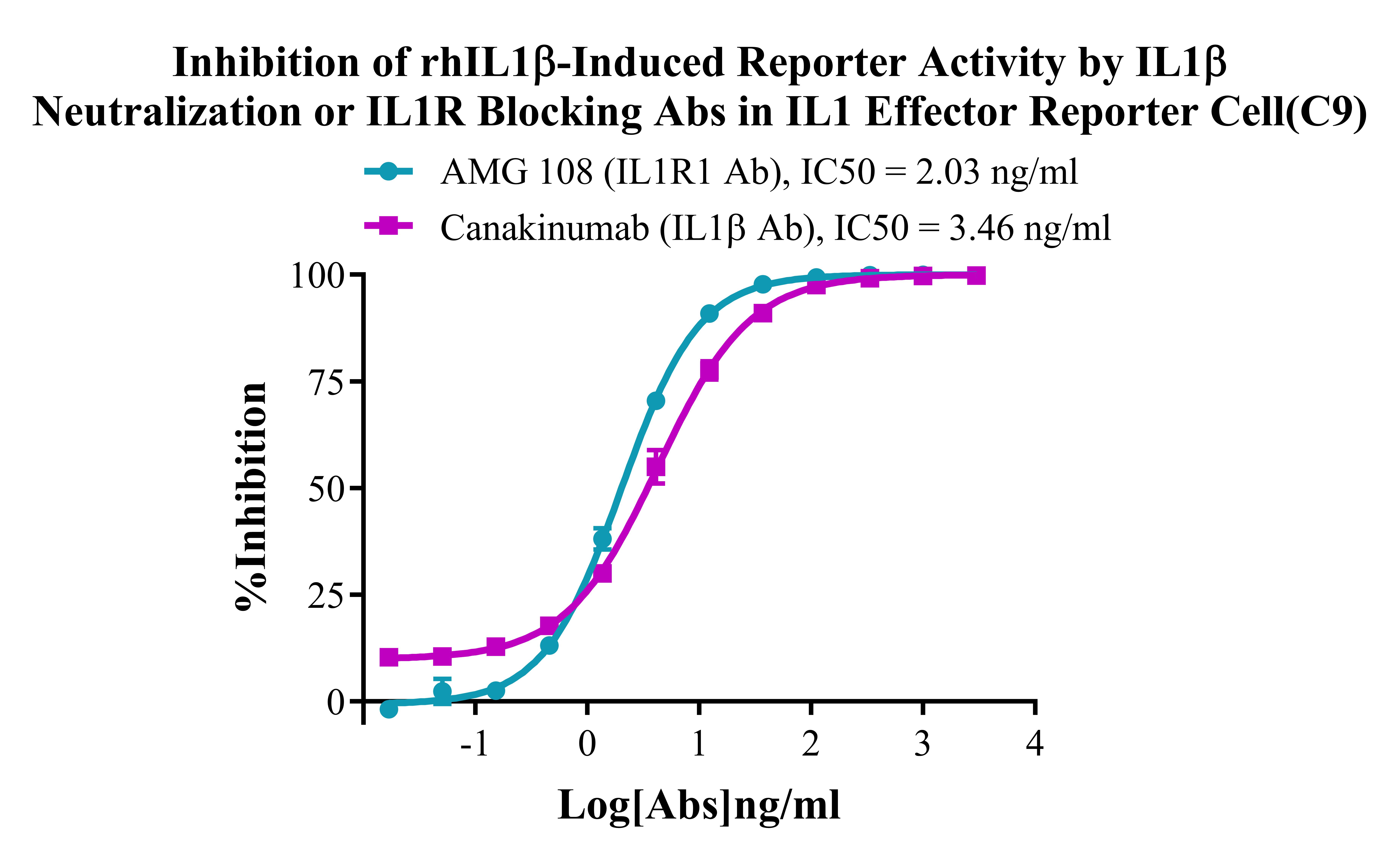 Figure 3. Inhibition of rhIL1β-Induced Reporter Activity by IL1β Neutralization or ILlR Blocking Abs in IL1 Effector Reporter Cell(C9).