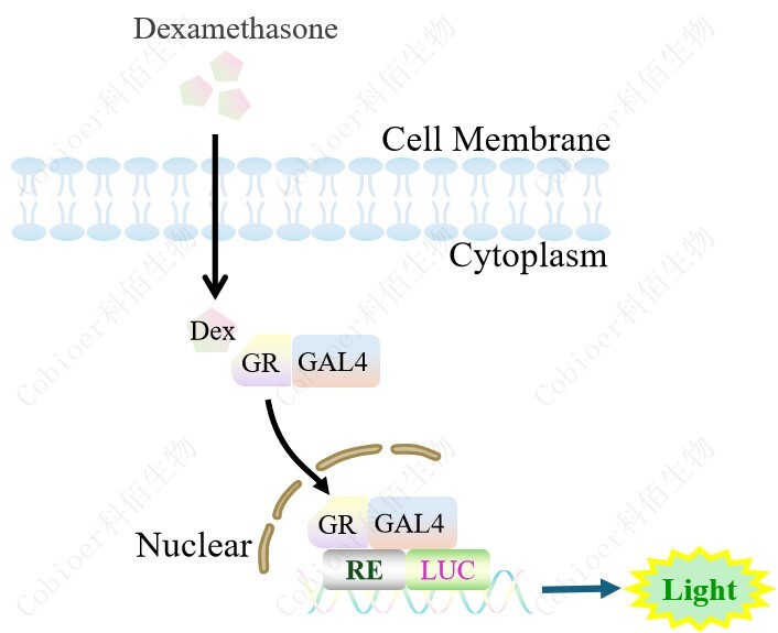 由 GR-GAL4 調(diào) 控并表達(dá) Luc 熒光素酶報(bào)告基因的 HEK293 細(xì)胞。Dexamethasone (Hexadecadrol,地塞米 松)是糖皮質(zhì)激素受體 (Glucocorticoid Receptor)激動(dòng)劑、凋亡誘導(dǎo)劑,原理見下圖所示。![]() Figure 1. GR-GAL4 Luciferase Reporter HEK293 細(xì)胞原理示意圖 |