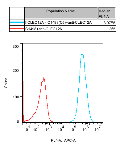 IV. Representative Data![]() Figure 1. Recombinant hCLEC12A/C1498 stably expressing hCLEC12A. |