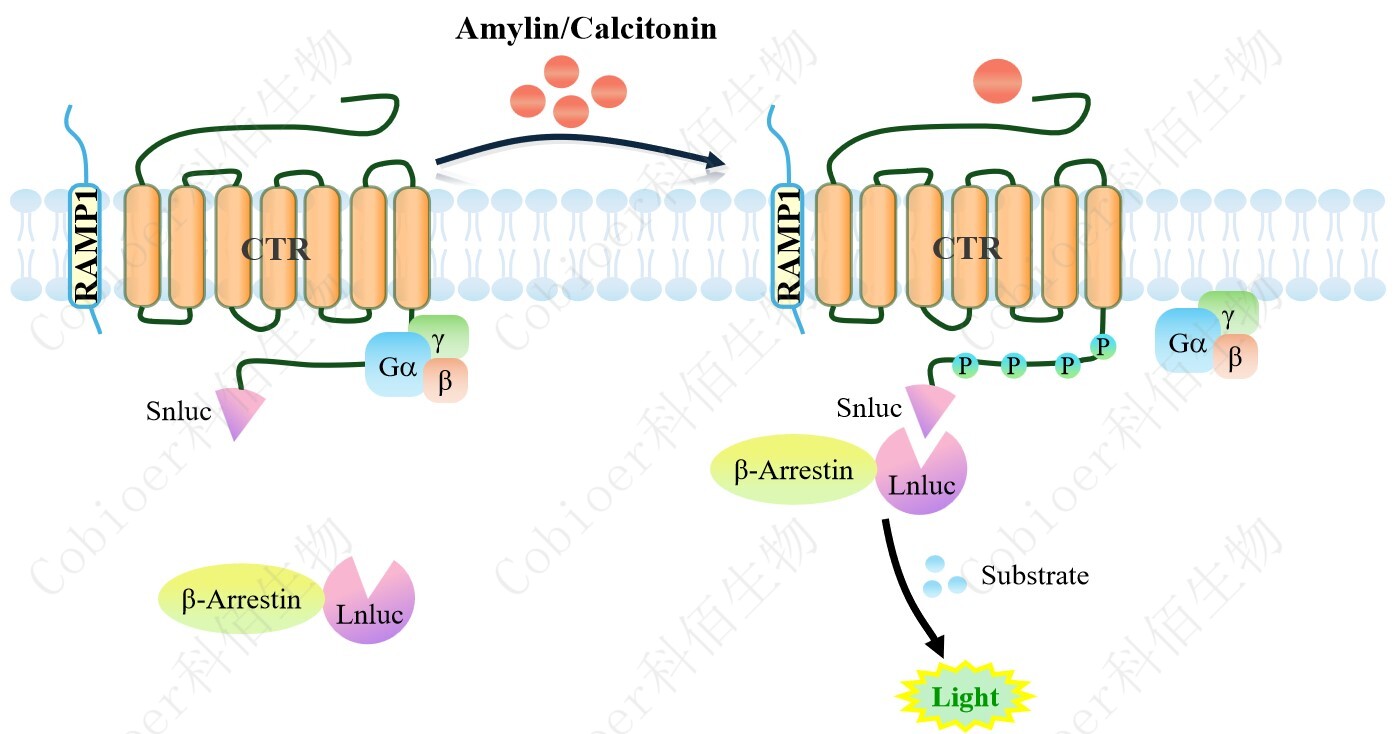 CTR&CTR&RAMP1 β-Arrestin CHO 報(bào)告基因藥靶模型很好的模擬了體內(nèi) CTR&RAMP1/β- Arrestin 的信號轉(zhuǎn)導(dǎo)過程 , 原理見下圖所 示 。 當(dāng)缺乏配體刺激時(shí) , β-Arrestin 不與CTR&RAMP1 結(jié)合,融合β-Arrestin 的熒光素酶處于失活構(gòu)象;當(dāng) CTR&RAMP1 遭遇配體 刺激時(shí),融合熒光素酶報(bào)告基因的β-Arrestin 被招募,使熒光素酶報(bào)告基因處于激活狀態(tài), 加入其底物后發(fā)光信號增強(qiáng)。