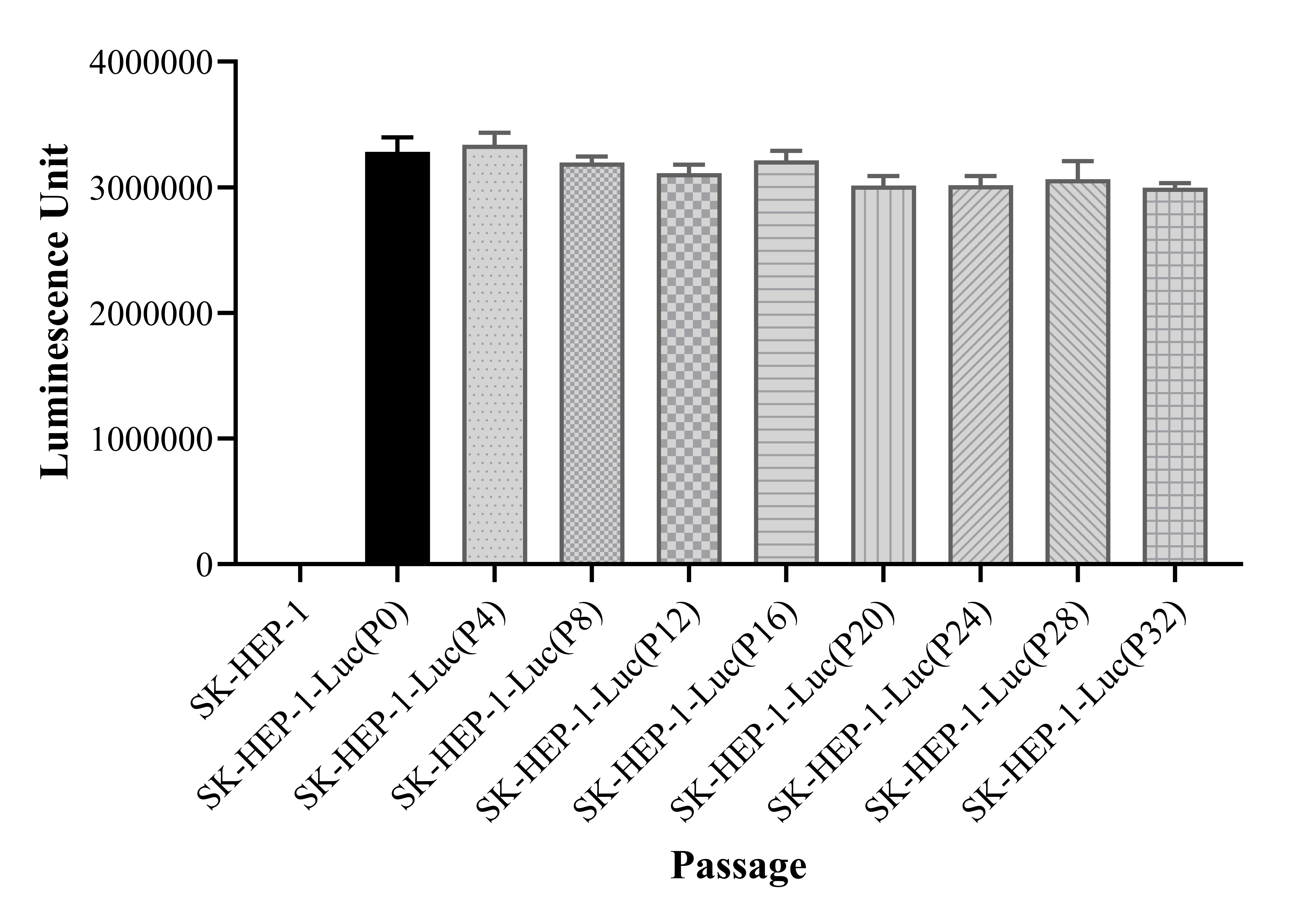 Figure 1. Stablity test results. SK-HEP-1-Luc showed at least 32 passage stability with similar luminescence unit.