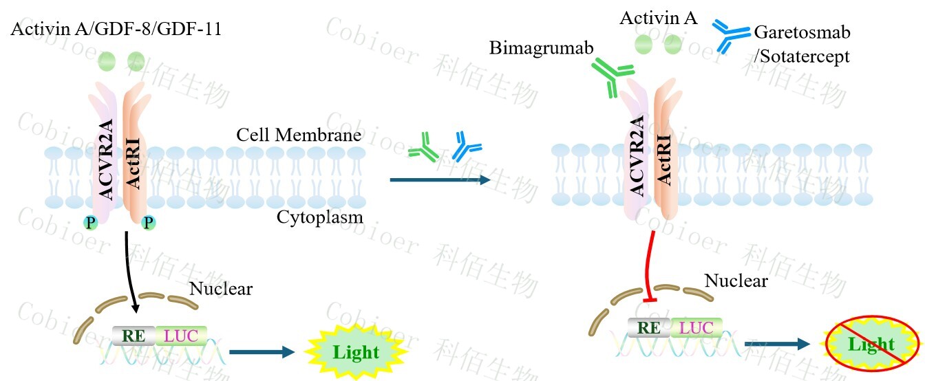 ACVR2A Effector Reporter Cell 報告基因藥靶模型很好的模擬了體內(nèi) ACVR2A 的信號 轉(zhuǎn)導(dǎo)過程,原理見下圖所示。