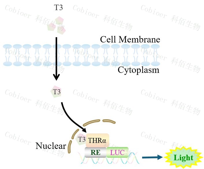 THRA Luciferase Reporter HEK293,是由 THRA 調(diào)控并表達(dá) Luc 熒光素 酶報(bào)告基因的 HEK293 細(xì)胞。甲狀腺激素(T3/T4)是一種有效的甲狀腺激素,主要通過(guò)結(jié) 合 TRs 發(fā)揮作用,調(diào)控基因表達(dá)和細(xì)胞功能,原理見(jiàn)下圖所示。 ![]() Figure 1. THRA Luciferase Reporter HEK293 原理示意圖