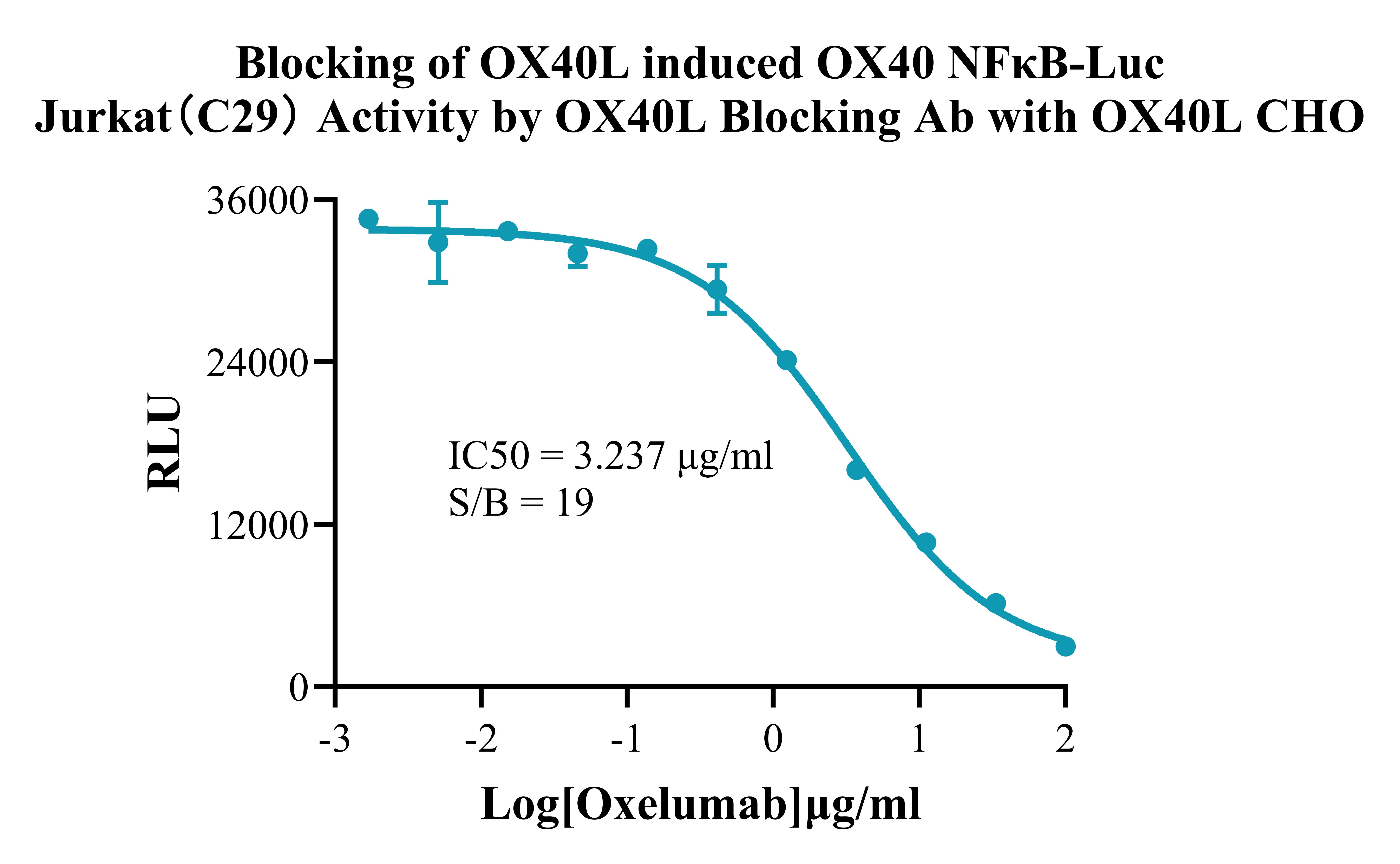 Figure 2. Blocking of OX40L induced OX40 NFκB-Luc Jurkat(C29) Activity by OX40L Blocking Ab with OX40L CHO.