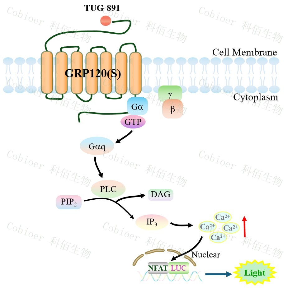 GPR120 與配體結(jié)合,導(dǎo)致 Gαq 亞基的激活,觸發(fā) PLC-γ,從而產(chǎn)生兩個(gè)第二信使: IP3 和 DAG,它們參與細(xì)胞內(nèi)鈣動(dòng)員。鈣離子濃度升高激活了 NFAT 轉(zhuǎn)錄因子家族。 GPR120(S) NFAT-Luc HEK293 細(xì)胞藥靶模型很好的模擬了體內(nèi) GPR120 的信號(hào)轉(zhuǎn)導(dǎo)過(guò)程, 原理見(jiàn)下圖所示。