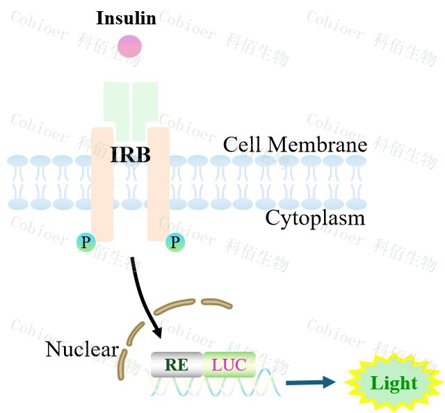 IRB Effector Reporter Cell 報(bào)告基因藥靶模型很好的模擬了體內(nèi) Insulin 的信號轉(zhuǎn)導(dǎo)過程, 原理見下圖所示。
