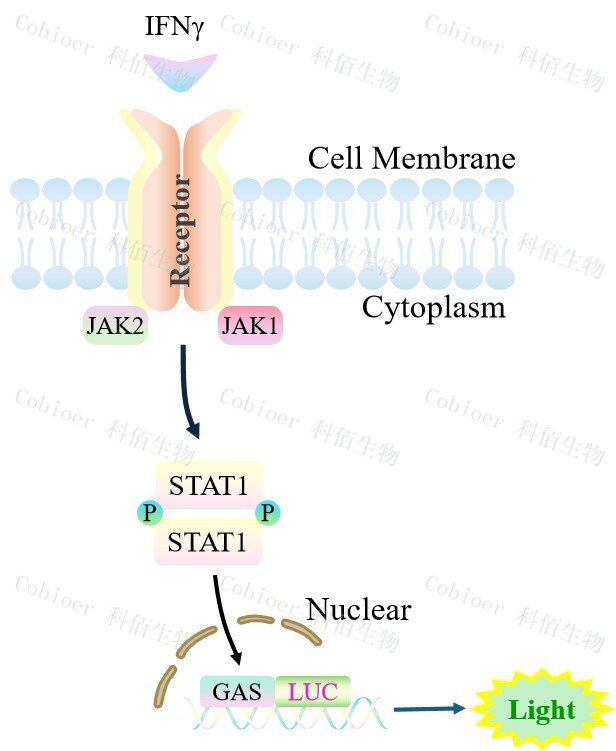 GAS-Luc HEK293 報告基因細(xì)胞,是由 GAS 調(diào)控并表達(dá) Luc 熒光素酶 報告基因的 HEK293 細(xì)胞。IFNγ與受體結(jié)合,激活 GAS 的原理見下圖所示。