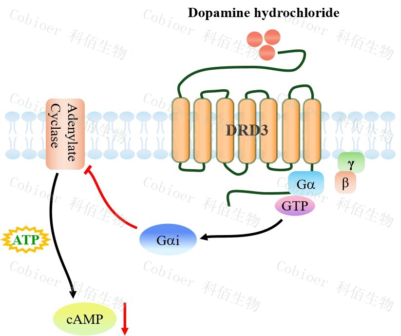 多巴胺(DA)是一種主要的兒茶酚胺神經(jīng)遞質(zhì),它與多巴胺受體(DRs)結(jié)合,因此 在中樞神經(jīng)系統(tǒng)(CNS)中起著重要作用,包括睡眠、工作記憶、情緒、學(xué)習(xí)等。DRs 是 由 DRD1、DRD2、DRD3、DRD4 和 DRD5 組成的 G 蛋白偶聯(lián)受體,根據(jù)它們對腺苷酸環(huán) 化酶(AC)活性的不同調(diào)節(jié)作用,分為 D1 樣受體(DRD1 和 DRD5)和 D2 樣受體(DRD 2、DRD3 和 DRD4)。 D2 樣受體與 Go 和 Gi 蛋白偶聯(lián),它們參與 AC 的失活,導(dǎo)致胞質(zhì)內(nèi) cAMP 水平降低。 DA 與 D2 樣受體的結(jié)合抑制 cAMP/PKA 信號通路,最終影響 CREB 磷酸化。DRD3 主要分 布于中樞神經(jīng)系統(tǒng)的邊緣區(qū)域,調(diào)控情緒及運動功能,是精神分裂癥、藥物成癮及帕金森 病的重要治療靶點。