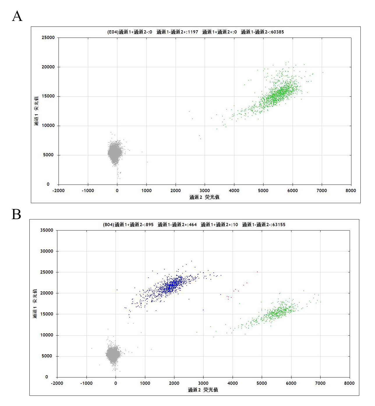 Figure 3.A: MCF7 Parental Cell;B:ESR1[D538G](Heterozygous,AF%:66.7) Isogenic MCF7 通道2 藍(lán)色微滴代表ESR1[D538G]突變陽性,通道2 綠色微滴代表該位點(diǎn)為陰性野生型