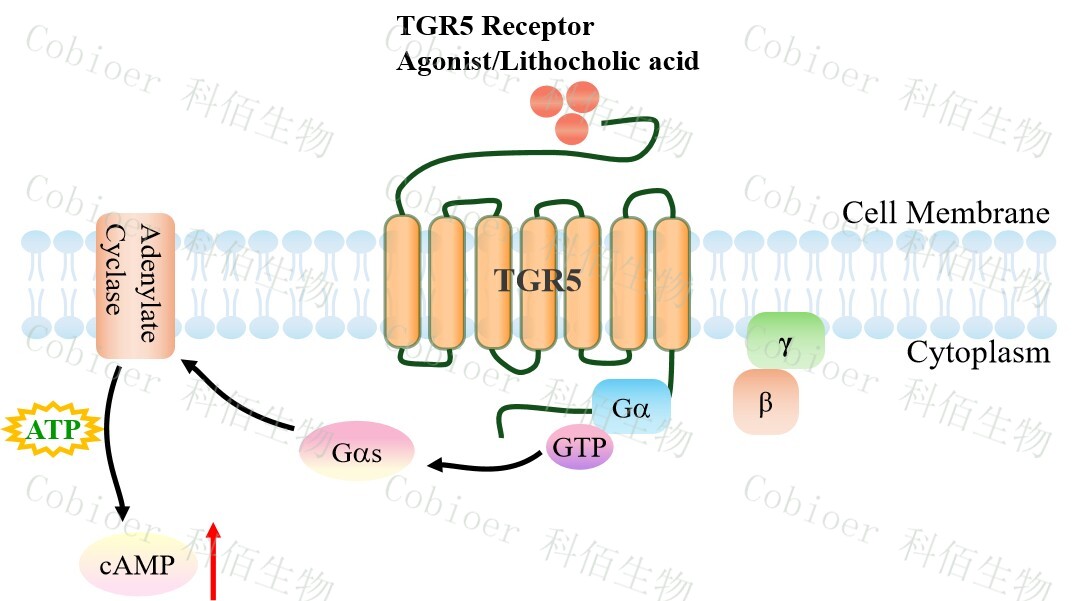 | TGR5 受體是第一個已知的膽汁酸特異性 G 蛋白偶聯(lián)受體,也被稱為膽汁酸受體 1(GPBAR1),屬于 A 類 GPCR 亞家族。該受體由七個跨膜螺旋(TMH1-7)、三個胞外環(huán) (ECL1-3)組成,有助于配體結(jié)合,以及三個胞內(nèi)環(huán)(ICL1-3),參與將信號傳遞給下游 信號分子。TGR5 在體內(nèi)廣泛存在,在膽囊、回腸、結(jié)腸、棕色脂肪組織、脾臟、肺、骨 骼肌、胰島,肝臟中均有表達。有文獻報道 TGR5 被認為是治療代謝性疾?。ㄈ?2 型糖尿 ?。┑臐撛诎悬c。此外,TGR5 還能降低單核細胞中促炎細胞因子的水平,在炎癥過程 (包括結(jié)腸炎和動脈粥樣硬化)中發(fā)揮核心作用的病理調(diào)節(jié)。 | |