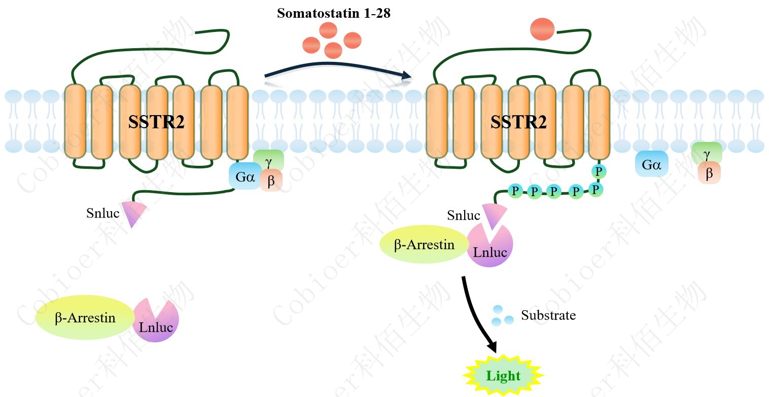 SSTR2 β-Arrestin CHO 報告基因藥靶模型很好的模擬了體內 SSTR2/β-Arrestin 的信號 轉導過程,原理見下圖所示。當缺乏配體刺激時,β-Arrestin 不與 SSTR2 結合,融合β- Arrestin 的熒光素酶處于失活構象,當 SSTR2 遭遇配體刺激時,融合熒光素酶報告基因的 β-Arrestin 被招募,使熒光素酶報告基因處于激活狀態(tài),加入其底物后發(fā)光信號增強。