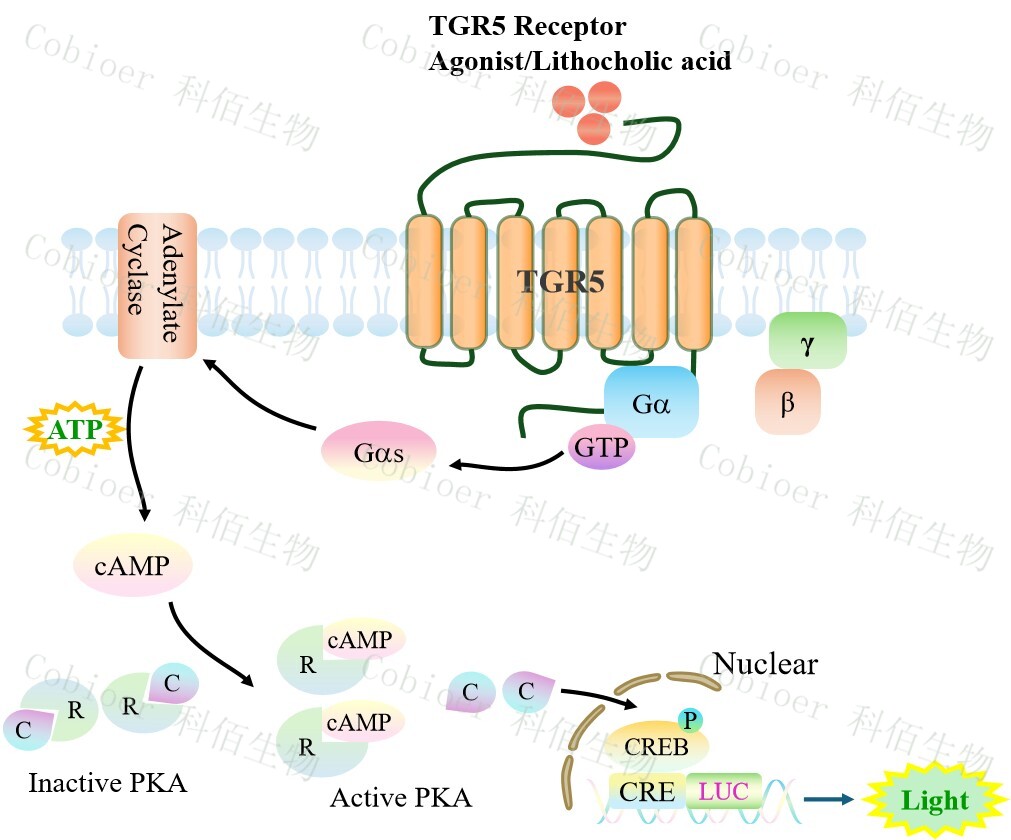 GPBAR1(TGR5) CRE-Luc HEK293 報(bào)告基因藥靶模型很好的模擬了體內(nèi) GPBAR1(TGR5) 的信號(hào)轉(zhuǎn)導(dǎo)過程,原理見下圖所示。