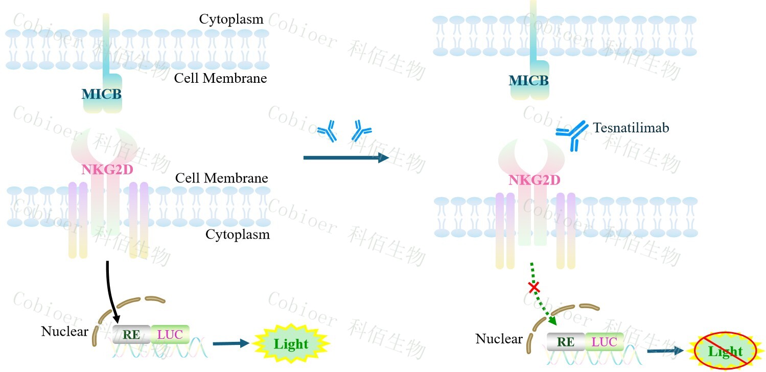 MICB CHO 作為 NKG2D Effector Reporter Cell 的靶細胞,很好的模擬了體內(nèi) NKG2D 的信號轉(zhuǎn)導過程,原理見下圖所示。