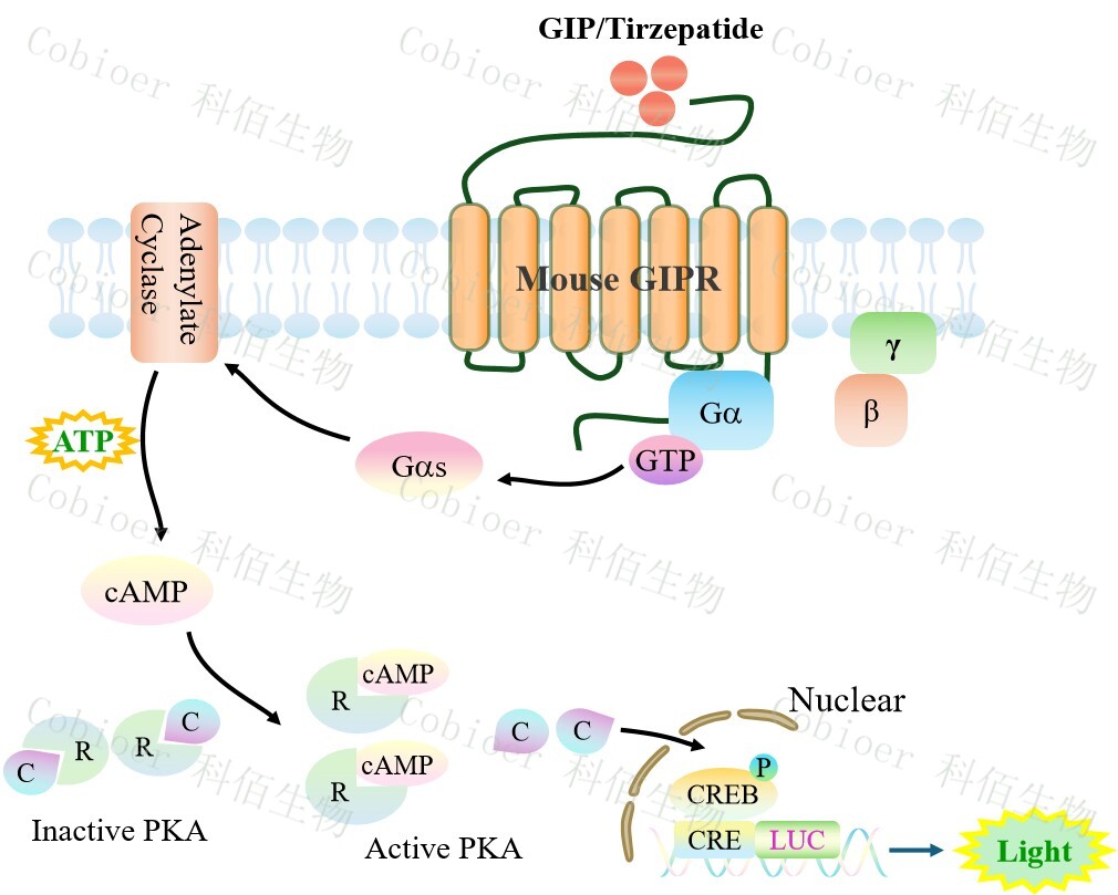 Mouse GIPR CRE-Luc HEK293 報(bào)告基因藥靶模型很好的模擬了體內(nèi) GIPR 的信號(hào)轉(zhuǎn)導(dǎo)過程,原理見下圖所示。