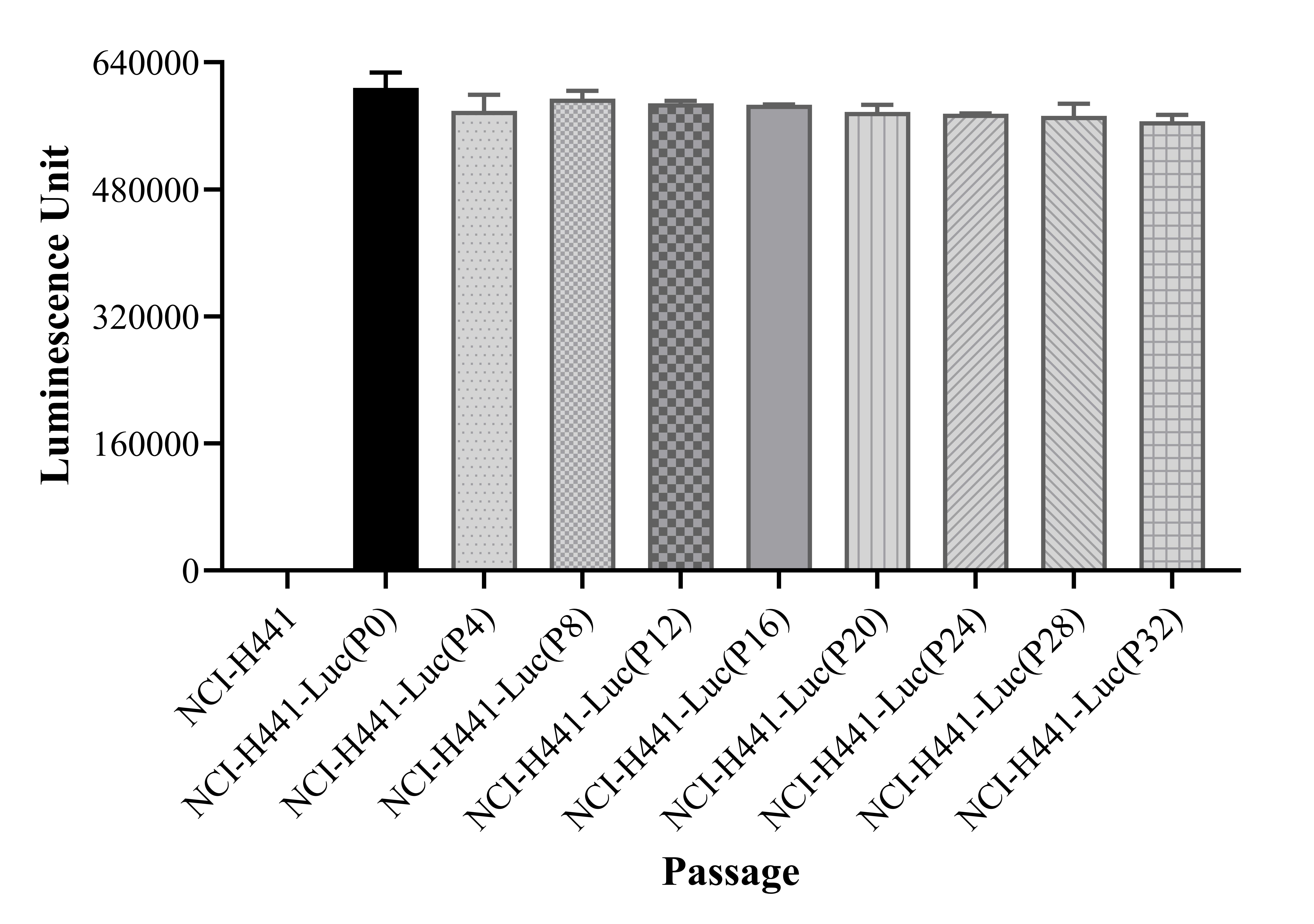 Figure 1. Stablity test results. NCI-H441-Luc showed at least 32 passage stability with similar luminescence unit.