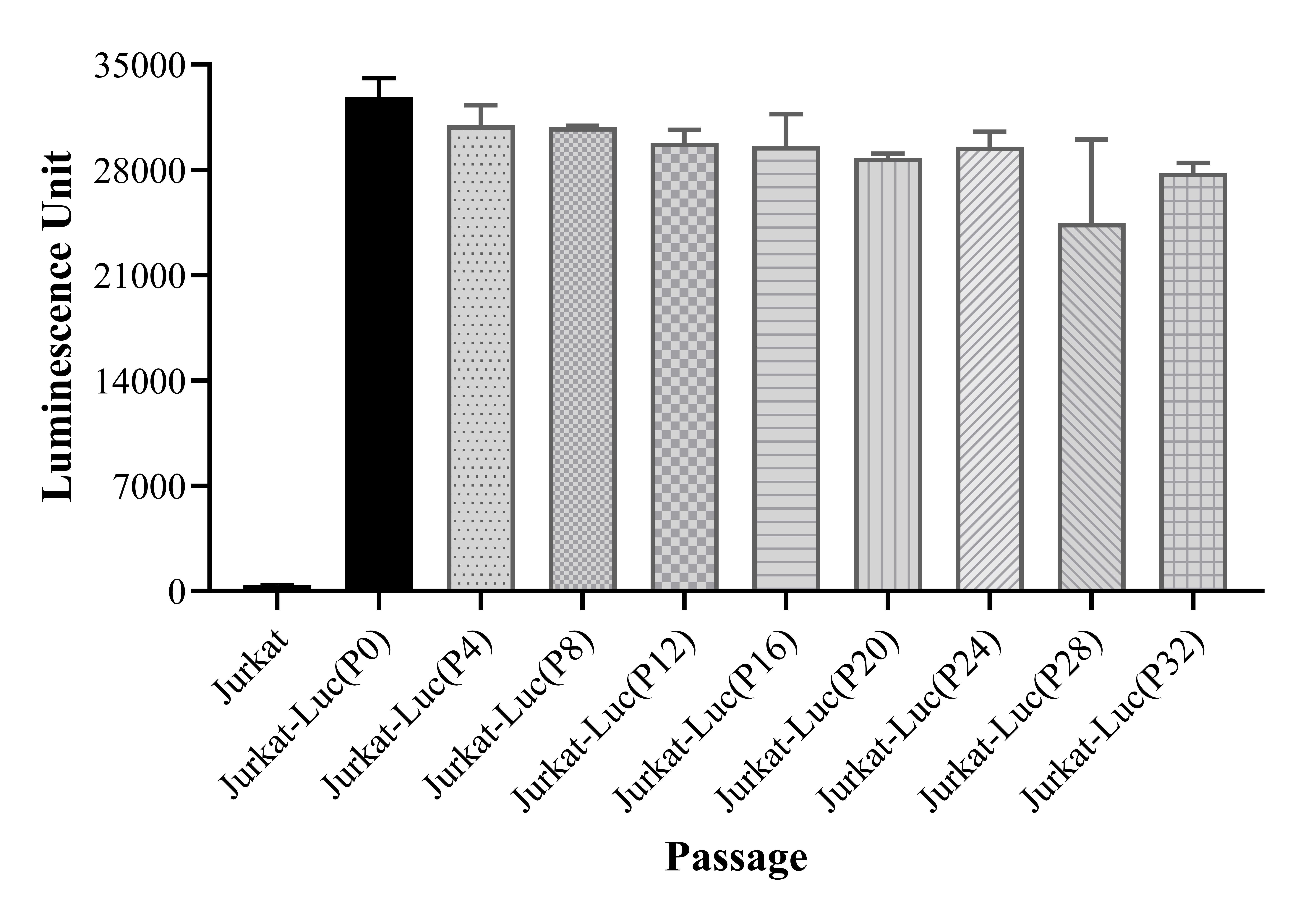 Figure 1. Stablity test results. Jurkat-Luc showed at least 32 passage stability with similar luminescence unit.