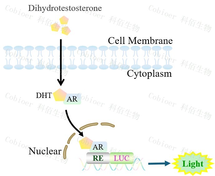 AR Reporter LNCAP Cell(DHT high sensitive)藥靶細(xì)胞,在由調(diào)控因子調(diào) 控并表達(dá)報(bào)告基因的重組細(xì)胞上,穩(wěn)定表達(dá)人 AR。雄激素的代謝產(chǎn)物 DHT(雙氫睪酮) 會(huì)與細(xì)胞上的 AR 結(jié)合,激活 AR 信號(hào)通路,原理見(jiàn)下圖所示。
