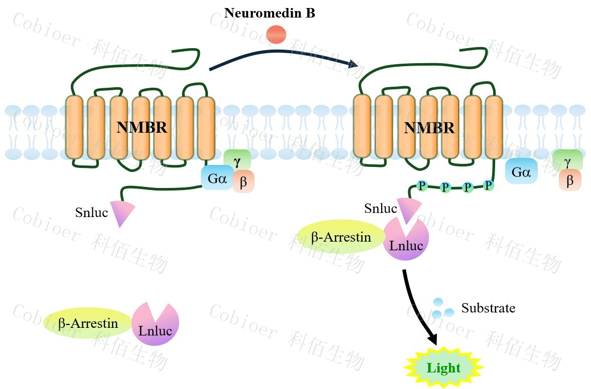 NMBR(BB1) β-Arrestin CHO 報告基因藥靶模型很好的模擬了體內(nèi) NMBR/β-Arrestin 的信號轉(zhuǎn)導(dǎo)過程,原理見下圖所示。當缺乏配體刺激時,β-Arrestin 不與 NMBR 結(jié)合,融合β- Arrestin 的熒光素酶處于失活構(gòu)象,當 NMBR 遭遇配體刺激時,融合熒光素酶報告基因的 β-Arrestin 被招募,使熒光素酶報告基因處于激活狀態(tài),加入其底物后發(fā)光信號增強。![]() Figure 1. NMBR(BB1) β-Arrestin CHO 細胞模型原理圖 |