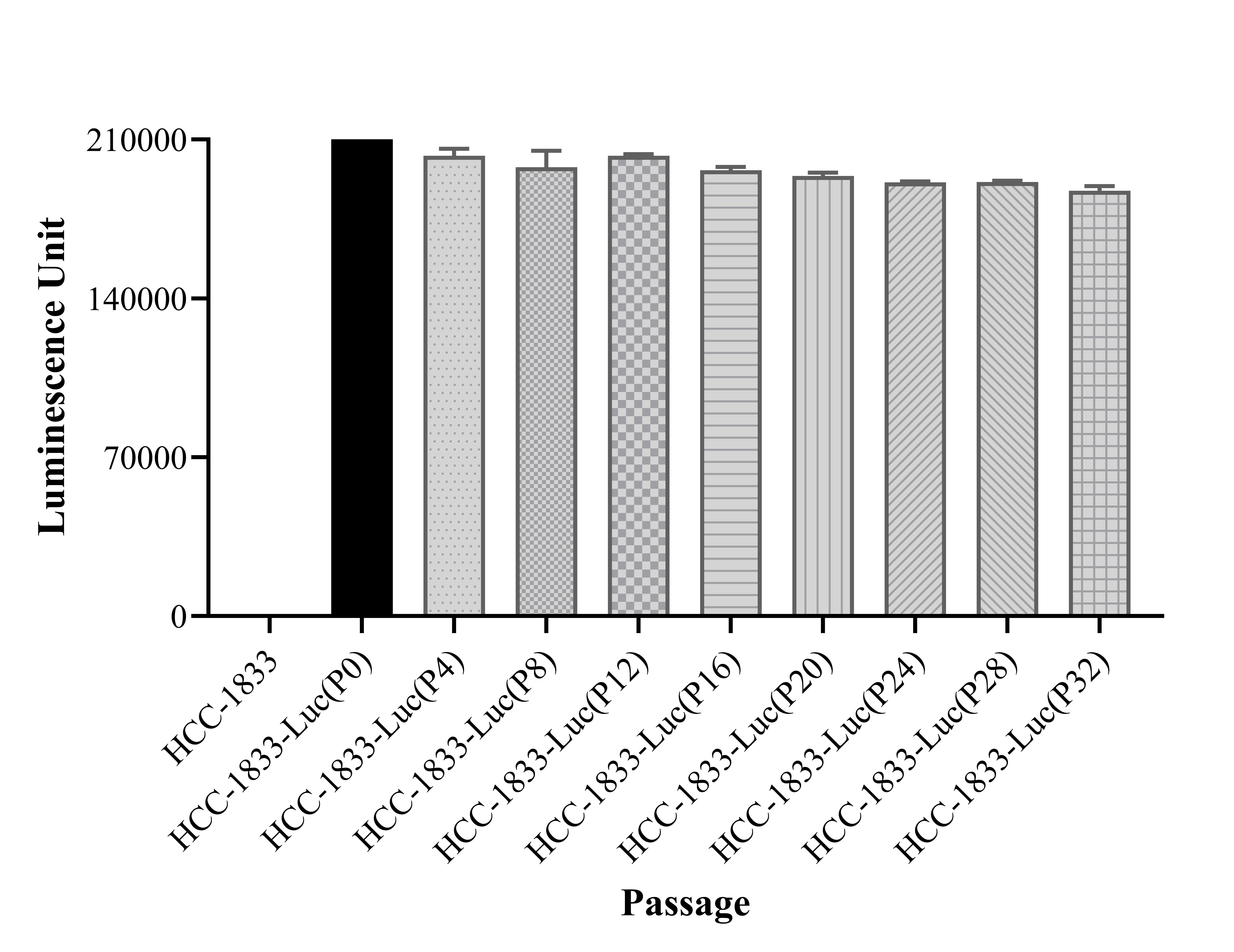 Figure 1. Stablity test results. HCC-1833-Luc showed at least 32 passage stability with similar luminescence unit. |