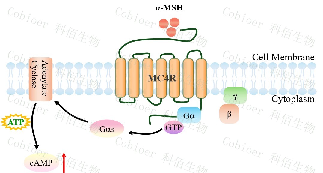 黑皮質素 4 受體(MC4R)是黑皮質素受體家族成員之一,其家族成員還包括:MC1R、 MC2R、MC3R 和 MC5R。該家族也是 GPCR 超家族中具有重大治療前景的一個亞家族, 屬于視紫紅質樣 A 類 GPCR。MC4R 主要分布于下丘腦室旁核、杏仁核等食欲與能量平衡 調控中樞,其內源性激動配體為α-黑素細胞刺激素(α-MSH),拮抗配體為刺豚鼠相關蛋 白(AgRP);該受體通過偶聯(lián) Gs 蛋白激活腺苷酸環(huán)化酶,引起 cAMP 升高,從而啟動 PKA/CREB 信號通路,并介導β-arrestin 依賴的 MAPK 活化,核心功能為抑制食欲、促進能 量消耗,其功能喪失性突變直接導致單基因肥胖、胰島素抵抗及代謝綜合征,而功能獲得 性突變則與反常的瘦表型相關。