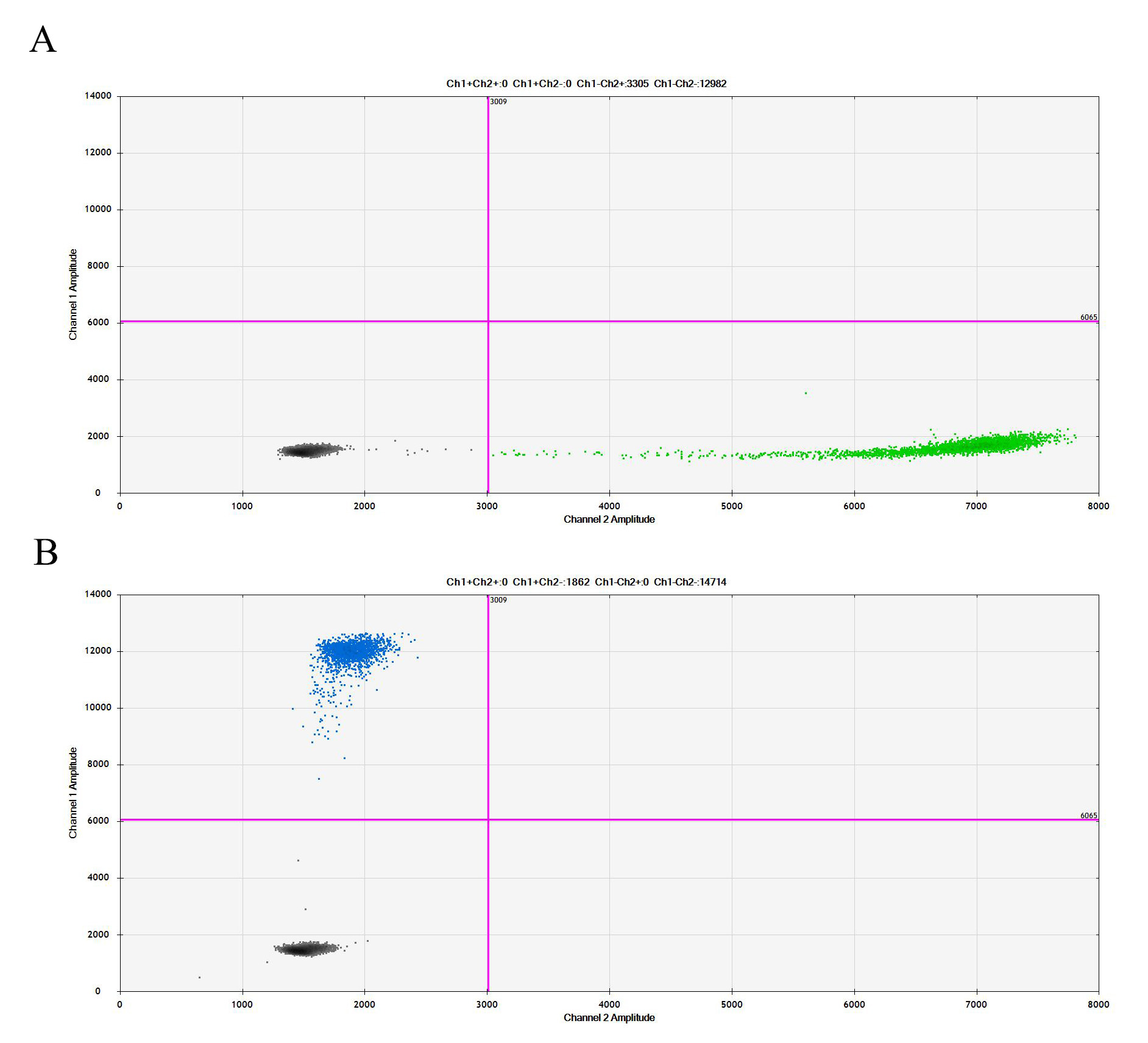 Figure 3. A:HCT116 Parental Cell;B:WRN[C727A](Homozygous,AF%:100) Isogenic HCT116 通道2 藍色微滴代表WRN[C727A]突變陽性,通道2 綠色微滴代表該位點為陰性野生型